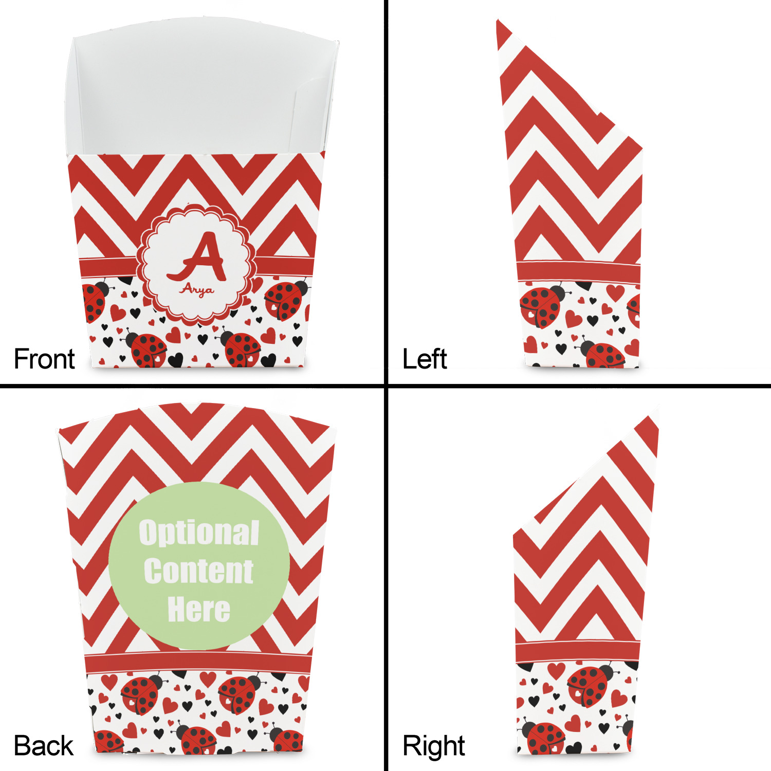 These favor boxes are printed in full color on quality cardstock - so coordinating the french fry favor boxes to match your event's themes or colors should be a breeze. You can upload your own design including artwork, logos or photos