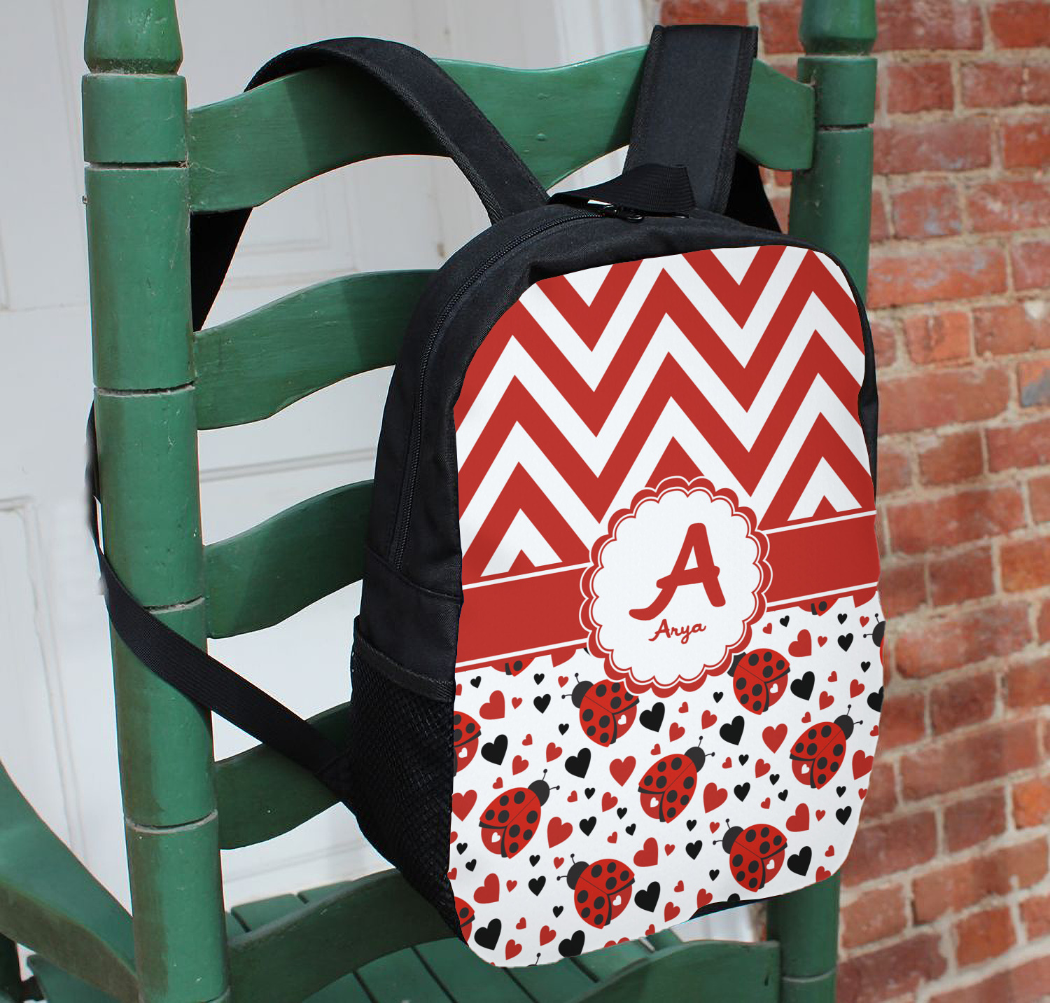 These small backpacks are made of a durable black canvas material with your personalization right on the front. The two shoulder straps are padded and easily adjustable. The bag itself measures at about 11" W x 15" H x 5" D. It's the perfect size for elementary aged kids or adults who want a smaller backpack. On the top of the bag you will find a handle to hang or carry your backpack by as well as a large zipper closure to keep all of your belongings safe inside. On each side of your backpack is a mesh pocket for a small item or water bottle. Inside your backpack you will find a spacious area with a small zipper pocket and a padded laptop slot that will fit up to a 13" laptop (13" being very snug). This is the perfect bag for any student that needs a couple books and their laptop with them at all times. It also works great as a carry on for traveling!