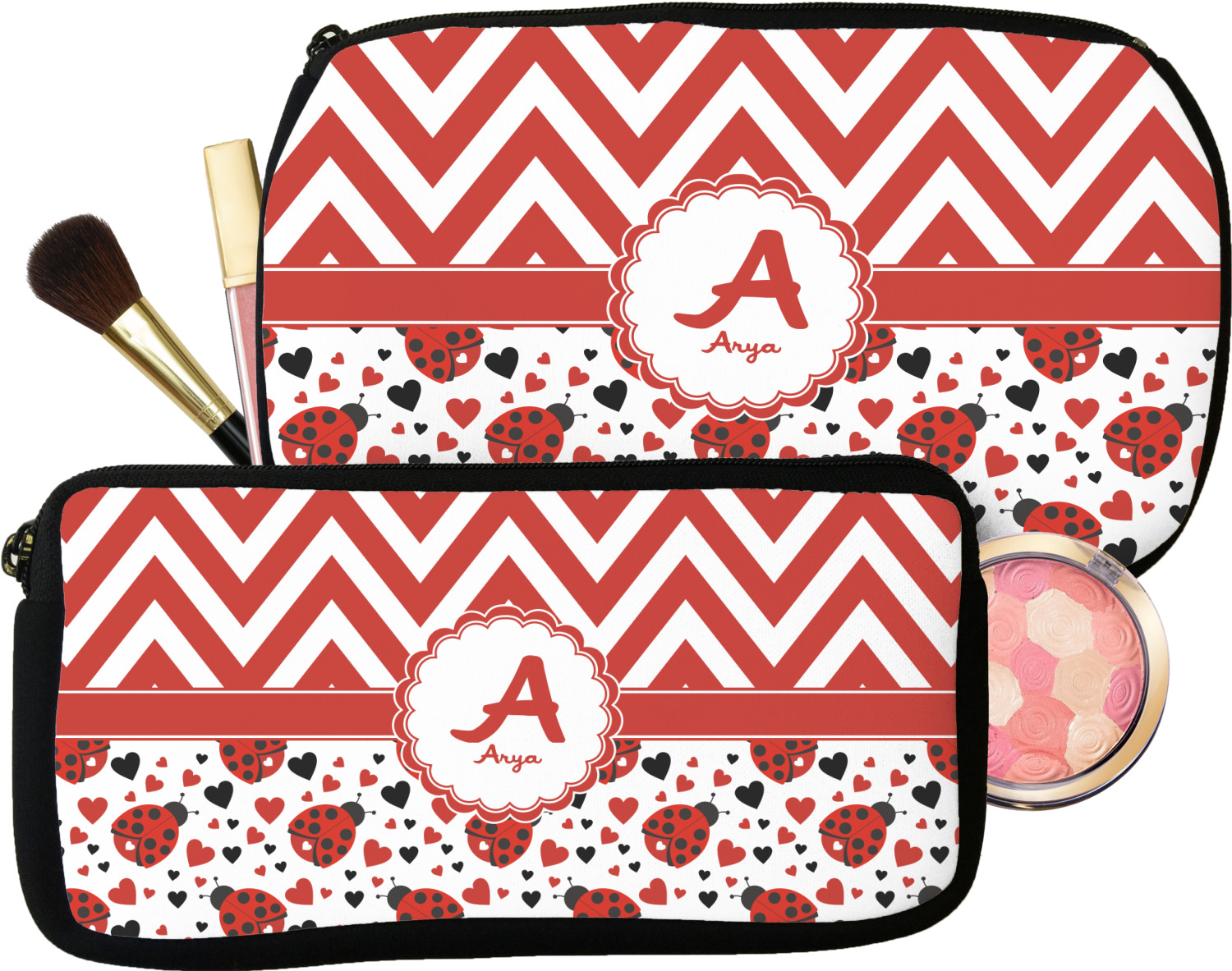 Our personalized makeup bags are available in many different designs, patterns and colors - so you are sure to find one that will love. They are made of neoprene (same material as wet-suits) and thus are water resistant, so spillages in your makeup bag will not end up all over you purse. They are customized on one side and are black on the other side and the zipper is black as well.