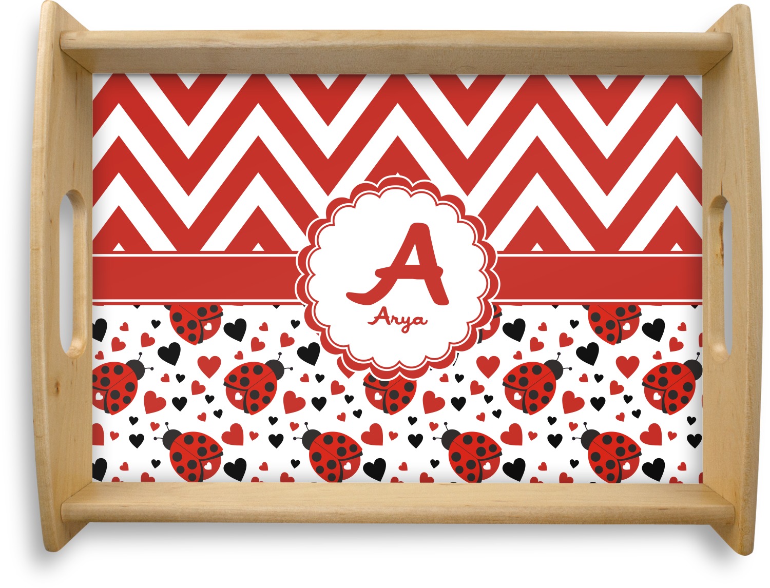 This serving tray with handles features square edges and two rounded sides, creating a very modern look. Each side is fabricated from a beautifully cut, natural wood. The bottom of the interior of the tray displays your customized design in bright, vibrant color. The tray is sold in both a black color and a natural wood look. Each variation of the wood serving tray has two sizes: Small, which is 14" x 10" x 2.25", and Large, which is 19.5" x 13.5" x 2.75".