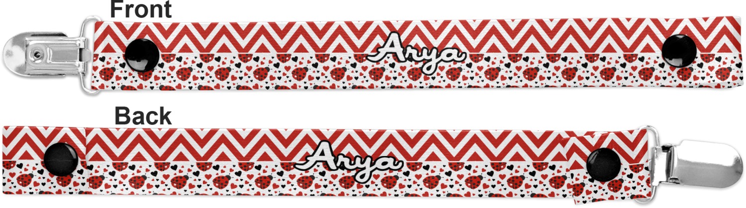 This personalized pacifier clip is the ideal size and measures at approximately 7.5 inches in length, when either end is snapped closed. On one end, you'll find a snap button. This button of your baby's pacifier holder is what can be attached to their pacifier to hold is securely in place. Simply open the snap, slip it through the pacifier opening, and snap it back into place. On the opposite end of this baby pacifier holder, you'll find a metal clip that can secure to a baby's collar or sleeve. This clip ensures that the strap stays in place, and that your baby's pacifier is always on hand.