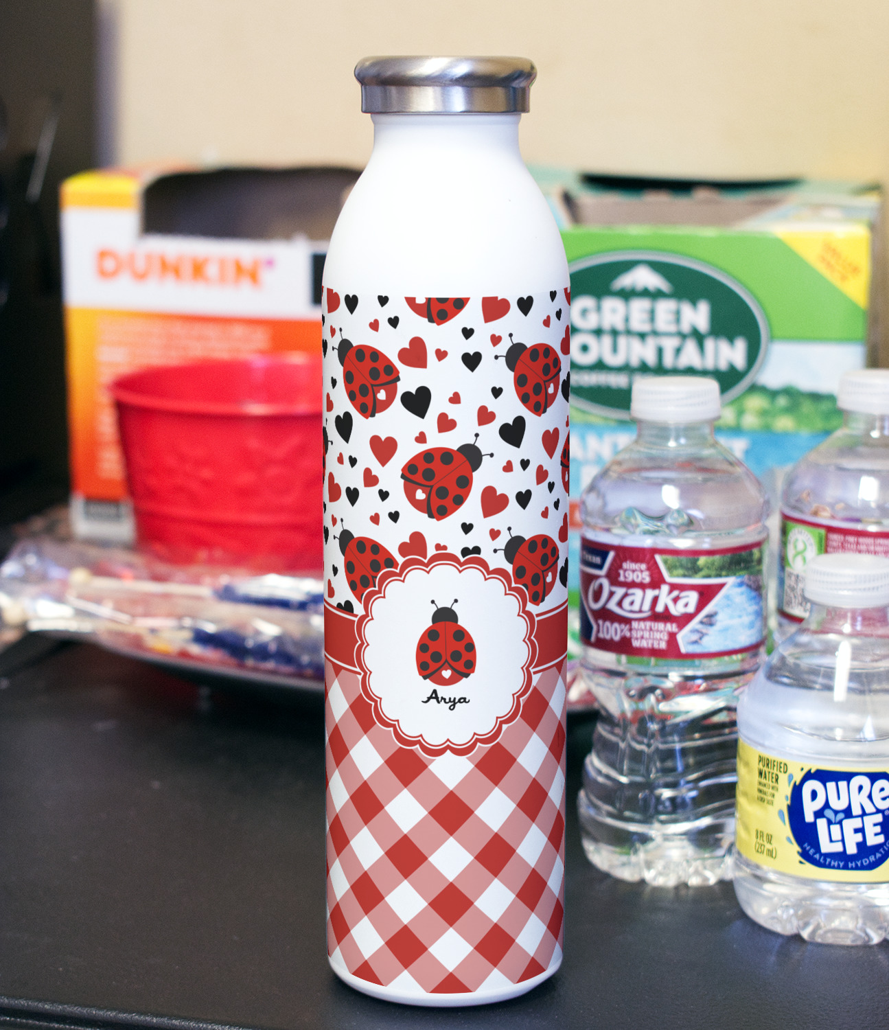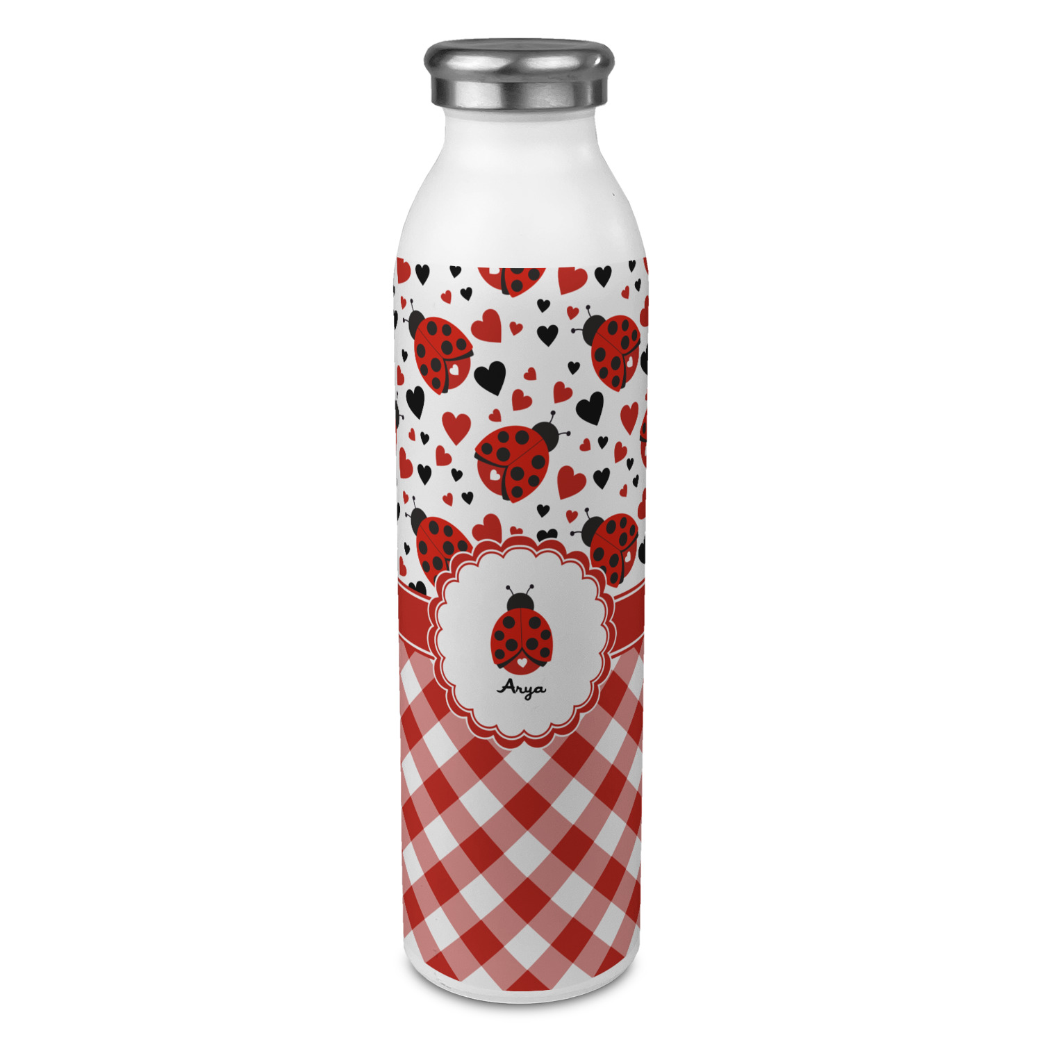 A wide band of red with an inset of black trim pulls the design together. A cute ladybug sits in the middle of a white scalloped circle label that is trimmed in double rows of red. Under the ladybug is ample room for custom personalization.