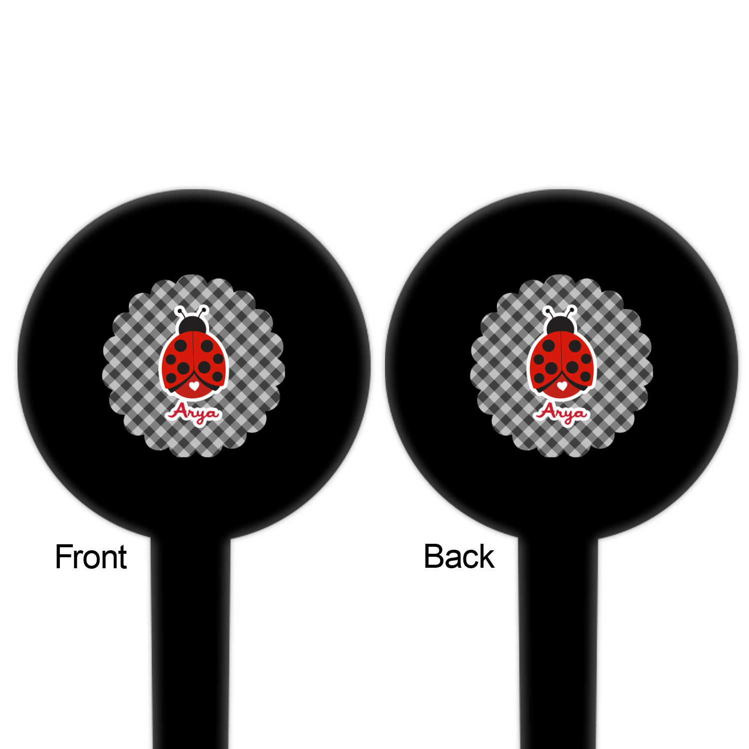 A wide band of red with an inset of black trim pulls the design together. A cute ladybug sits in the middle of a white scalloped circle label that is trimmed in double rows of red. Under the ladybug is ample room for custom personalization.