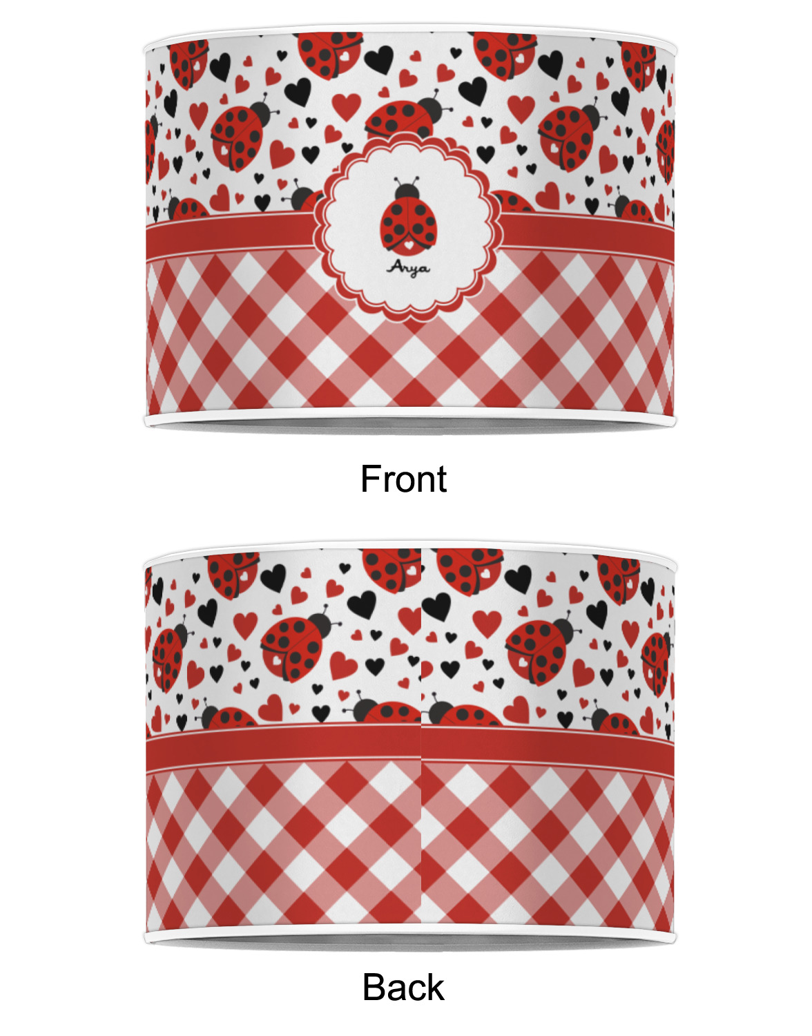 Ladybugs stand for luck so why not start your day off surrounded by the symbol of luck? On the top part of the design our little ladybugs are surrounded by coordinating black and red hearts. As if the ladybugs weren't sweet enough we added a touch of nostalgia by including the all American red and white gingham pattern to the bottom of this wonderful and warm design.