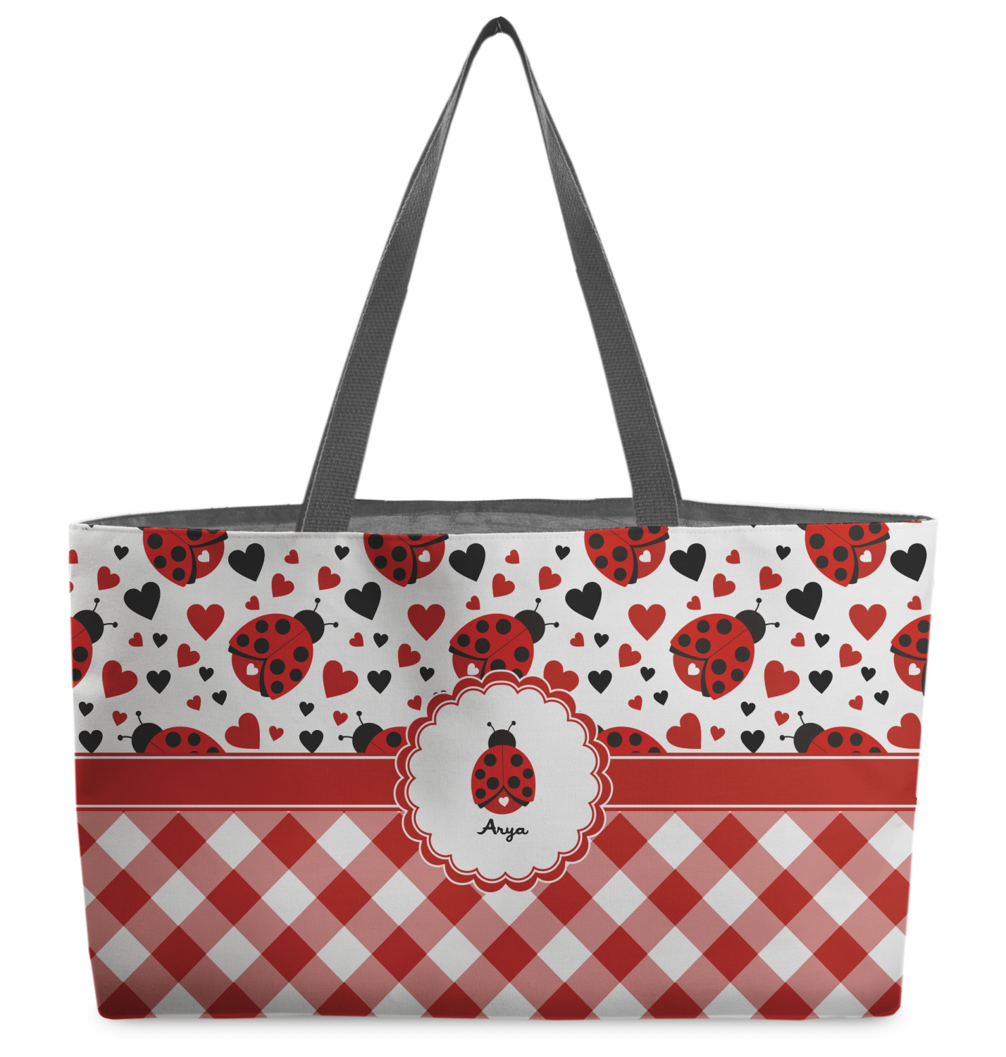 Ladybugs stand for luck so why not start your day off surrounded by the symbol of luck? On the top part of the design our little ladybugs are surrounded by coordinating black and red hearts. As if the ladybugs weren't sweet enough we added a touch of nostalgia by including the all American red and white gingham pattern to the bottom of this wonderful and warm design.