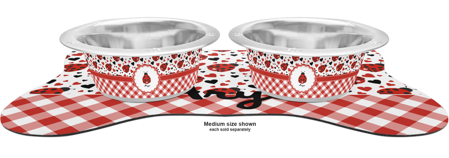 The top of this mat displays your custom design, as it is printed on polyester. To prevent slippage, the underside of the mat is made of rubber. We offer a small dog food mat, suitable for smaller dogs and a large dog food mat for bigger breeds. The small dog food mat is approximately 19 by 13 inches, while the large dog feeding mat measures at approximately 26.75 by 18 inches. Both personalized mats are ideally sized to fit two dog bowls.