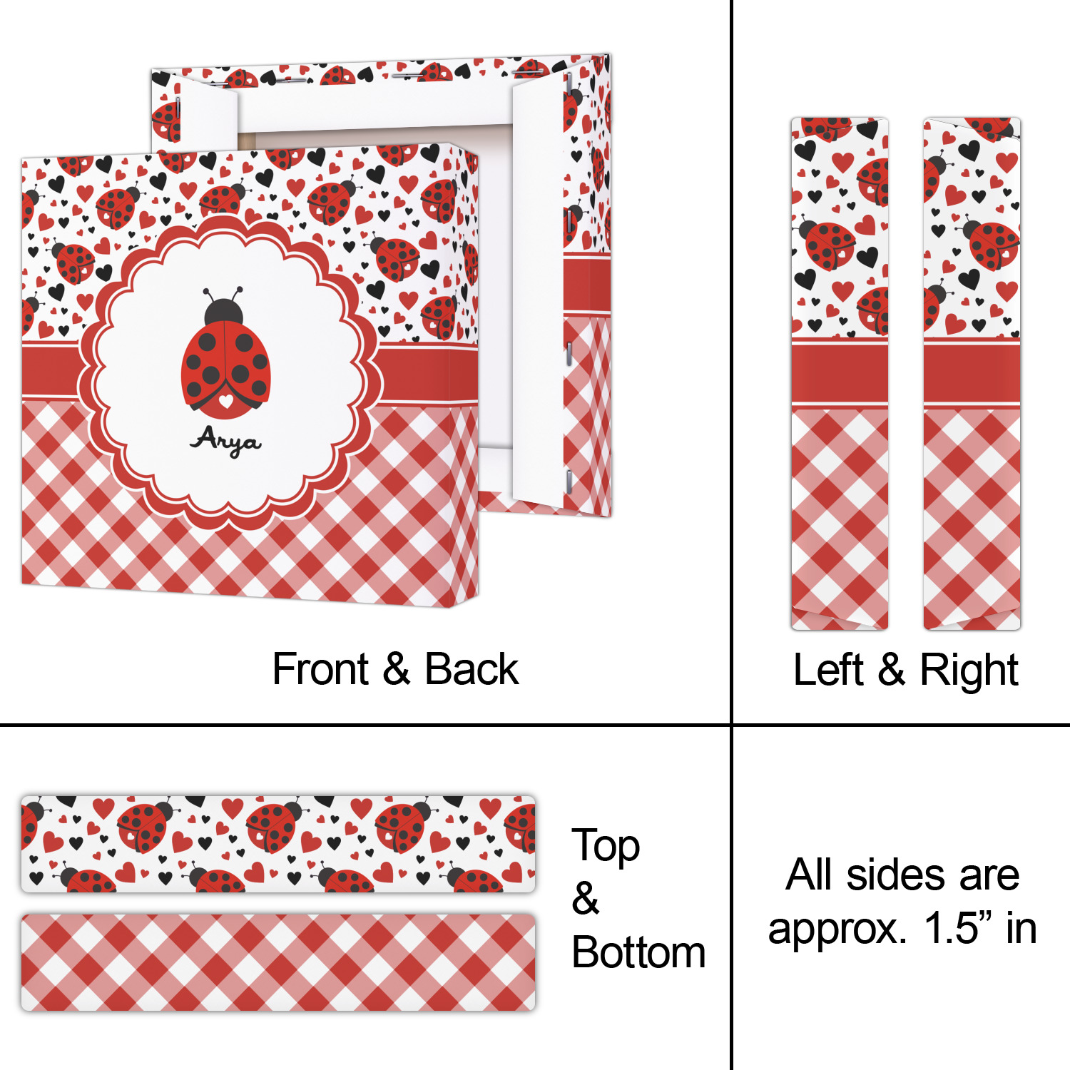 A wide band of red with an inset of black trim pulls the design together. A cute ladybug sits in the middle of a white scalloped circle label that is trimmed in double rows of red. Under the ladybug is ample room for custom personalization.