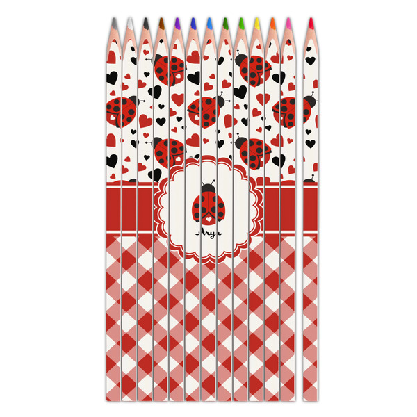 A wide band of red with an inset of black trim pulls the design together. A cute ladybug sits in the middle of a white scalloped circle label that is trimmed in double rows of red. Under the ladybug is ample room for custom personalization.