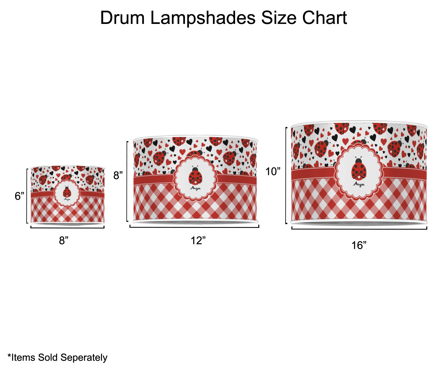 Our customized lamp shades also come in 3 different sizes: 8", 12" and 16", measuring at 8" in diameter by 6" tall, 12" in diameter by 8" tall, and 16" in diameter by 10" tall, respectively.