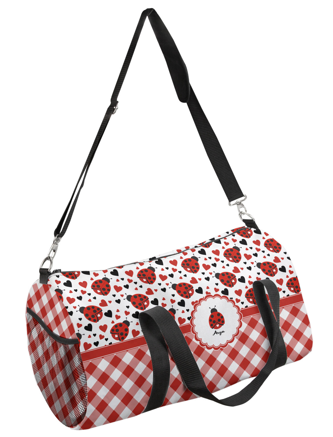 Ladybugs stand for luck so why not start your day off surrounded by the symbol of luck? On the top part of the design our little ladybugs are surrounded by coordinating black and red hearts. As if the ladybugs weren't sweet enough we added a touch of nostalgia by including the all American red and white gingham pattern to the bottom of this wonderful and warm design.