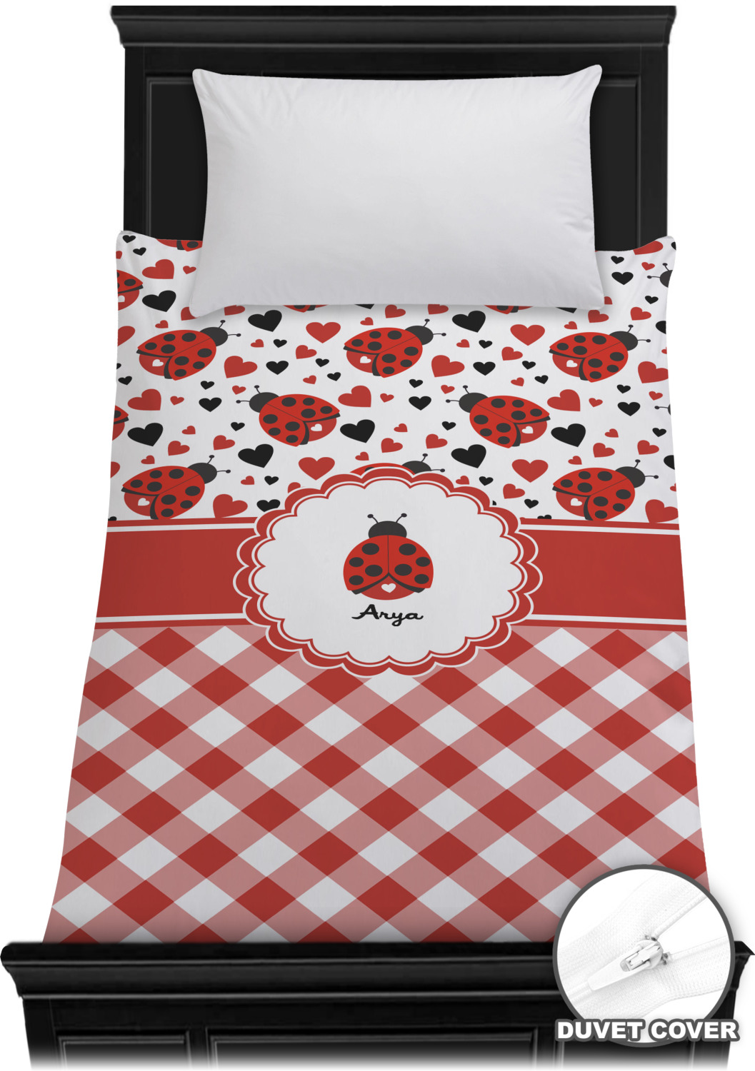 Ladybugs stand for luck so why not start your day off surrounded by the symbol of luck? On the top part of the design our little ladybugs are surrounded by coordinating black and red hearts. As if the ladybugs weren't sweet enough we added a touch of nostalgia by including the all American red and white gingham pattern to the bottom of this wonderful and warm design.