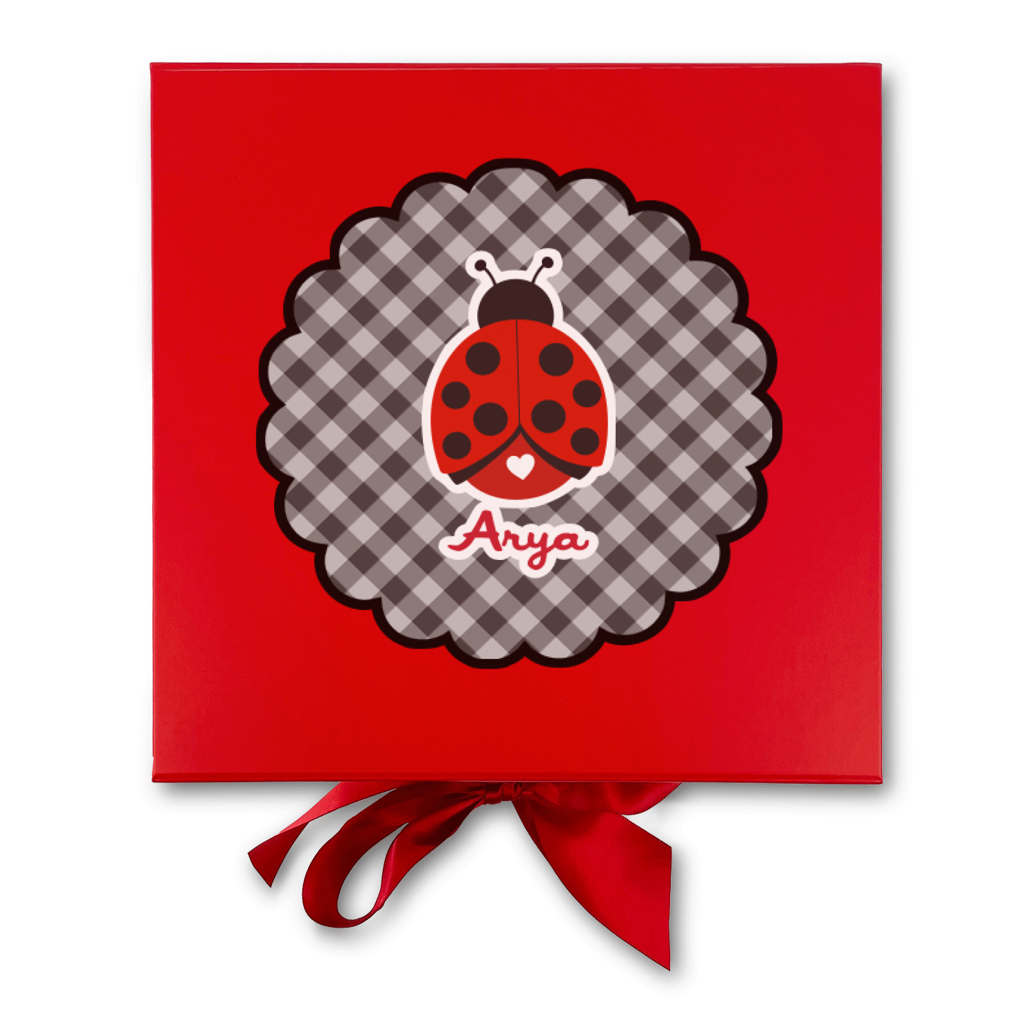 A wide band of red with an inset of black trim pulls the design together. A cute ladybug sits in the middle of a white scalloped circle label that is trimmed in double rows of red. Under the ladybug is ample room for custom personalization.