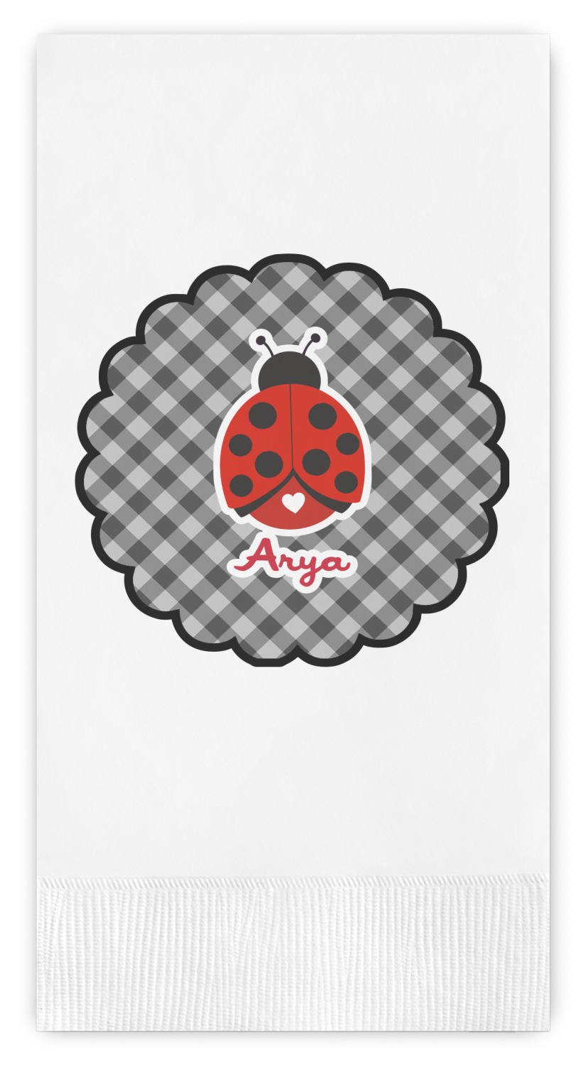 A wide band of red with an inset of black trim pulls the design together. A cute ladybug sits in the middle of a white scalloped circle label that is trimmed in double rows of red. Under the ladybug is ample room for custom personalization.