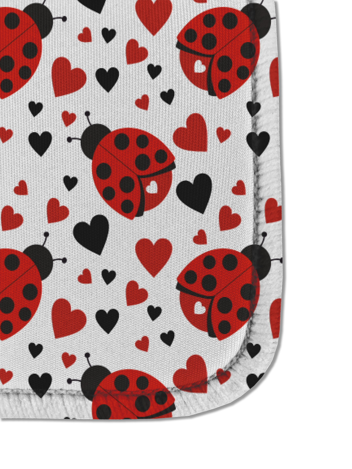 Ladybugs stand for luck so why not start your day off surrounded by the symbol of luck? On the top part of the design our little ladybugs are surrounded by coordinating black and red hearts. As if the ladybugs weren't sweet enough we added a touch of nostalgia by including the all American red and white gingham pattern to the bottom of this wonderful and warm design.