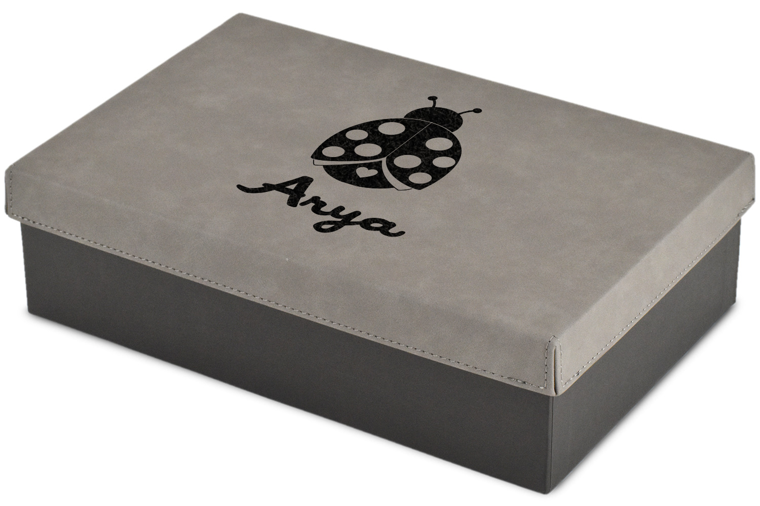These gift boxes are available in 3 different sizes to accommodate various sized gifts. Available in gray as a neutral color for any occasion as well as to showcase your design boldly. Engraved with a laser this high quality paper board and faux leather gift box is unique and makes any gift stand out.