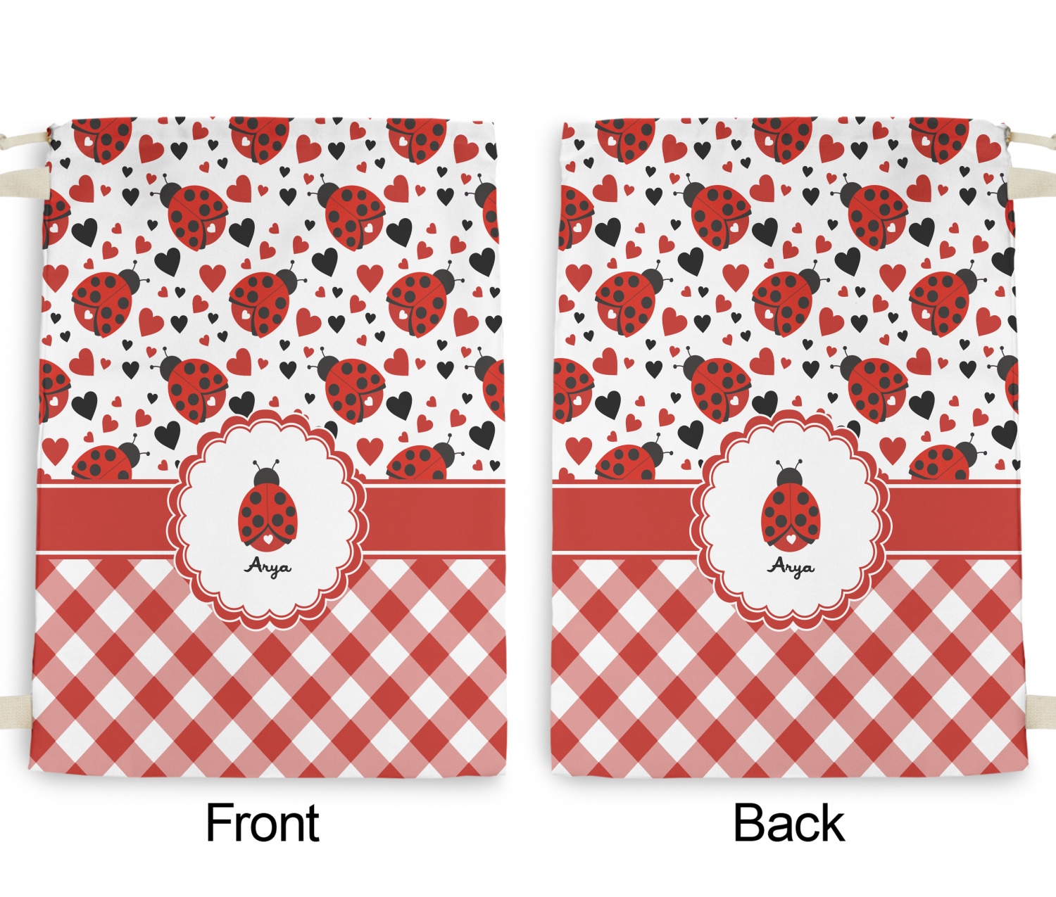 A wide band of red with an inset of black trim pulls the design together. A cute ladybug sits in the middle of a white scalloped circle label that is trimmed in double rows of red. Under the ladybug is ample room for custom personalization.