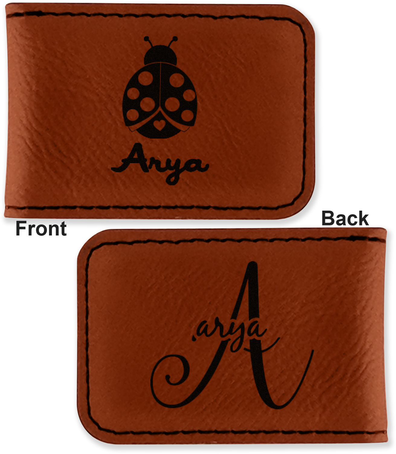 Your money clip will be laser engraved so that the design you choose will come out black. Find a fun graphic, monogram, or font to use to personalize your money clip either on just the front or the front and the back.