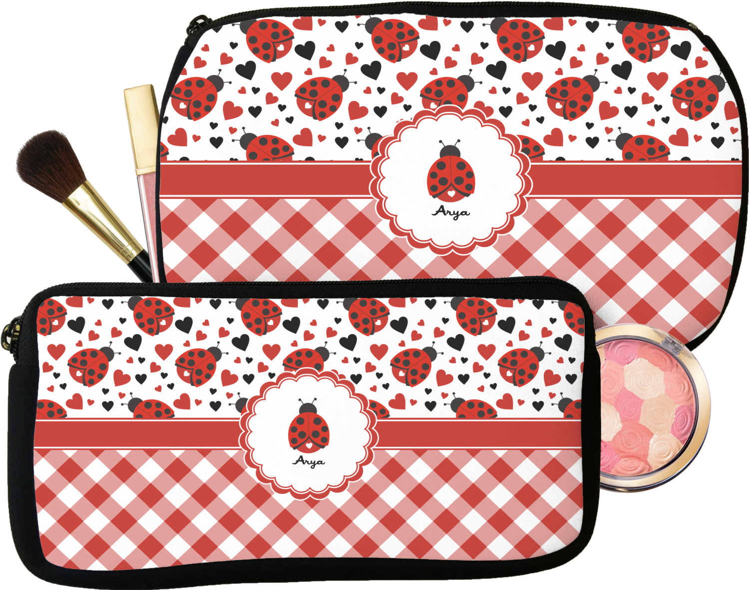 Our personalized makeup bags are available in many different designs, patterns and colors - so you are sure to find one that will love. They are made of neoprene (same material as wet-suits) and thus are water resistant, so spillages in your makeup bag will not end up all over you purse. They are customized on one side and are black on the other side and the zipper is black as well.