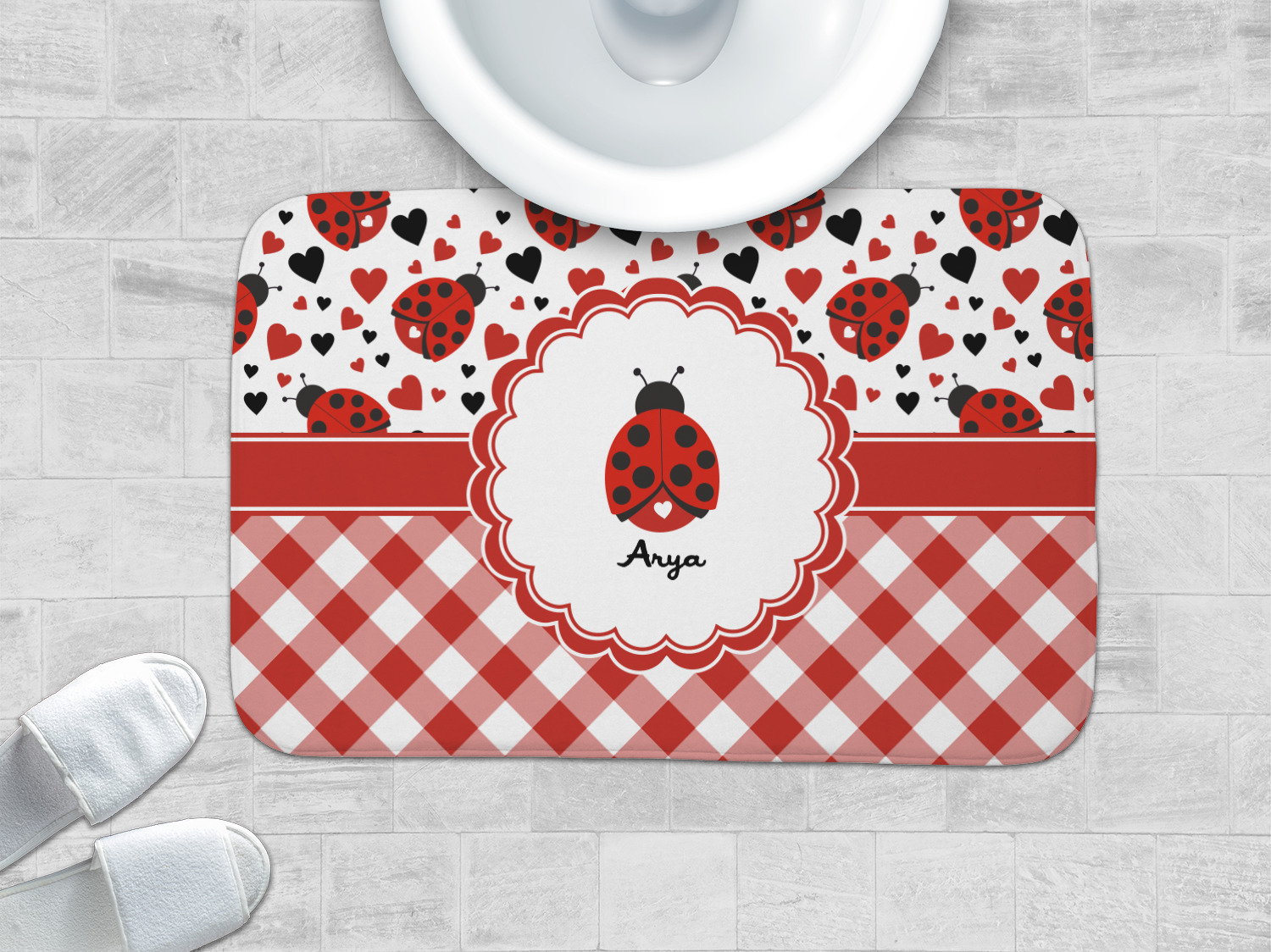 Ladybugs stand for luck so why not start your day off surrounded by the symbol of luck? On the top part of the design our little ladybugs are surrounded by coordinating black and red hearts. As if the ladybugs weren't sweet enough we added a touch of nostalgia by including the all American red and white gingham pattern to the bottom of this wonderful and warm design.