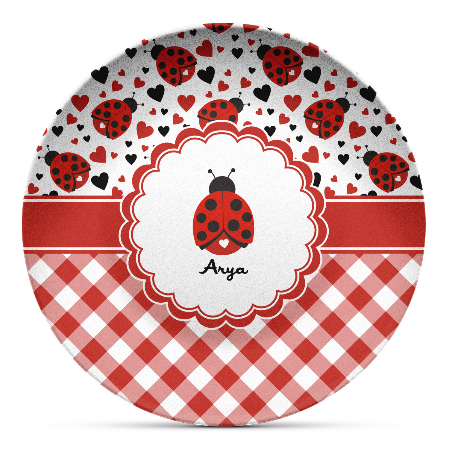A wide band of red with an inset of black trim pulls the design together. A cute ladybug sits in the middle of a white scalloped circle label that is trimmed in double rows of red. Under the ladybug is ample room for custom personalization.