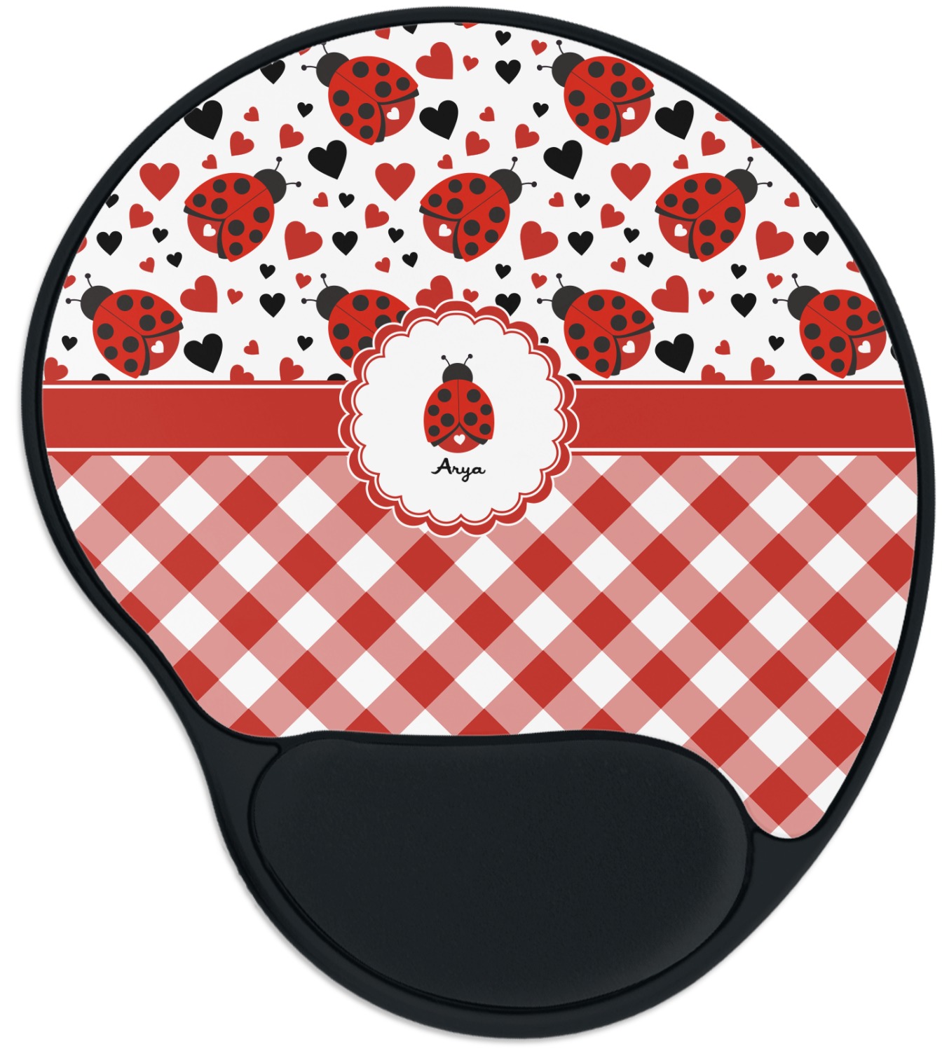 Ladybugs stand for luck so why not start your day off surrounded by the symbol of luck? On the top part of the design our little ladybugs are surrounded by coordinating black and red hearts. As if the ladybugs weren't sweet enough we added a touch of nostalgia by including the all American red and white gingham pattern to the bottom of this wonderful and warm design.