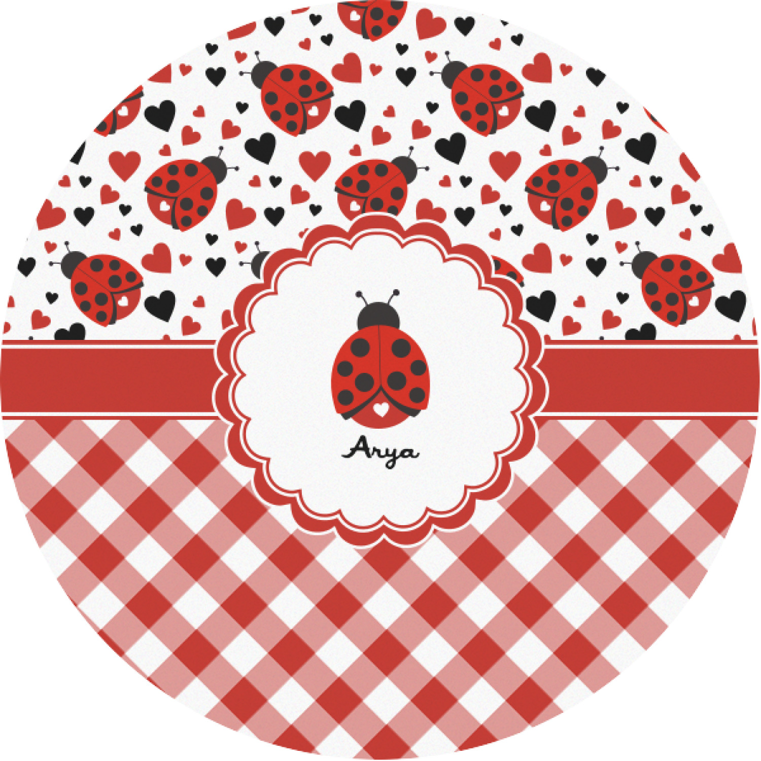 A wide band of red with an inset of black trim pulls the design together. A cute ladybug sits in the middle of a white scalloped circle label that is trimmed in double rows of red. Under the ladybug is ample room for custom personalization.