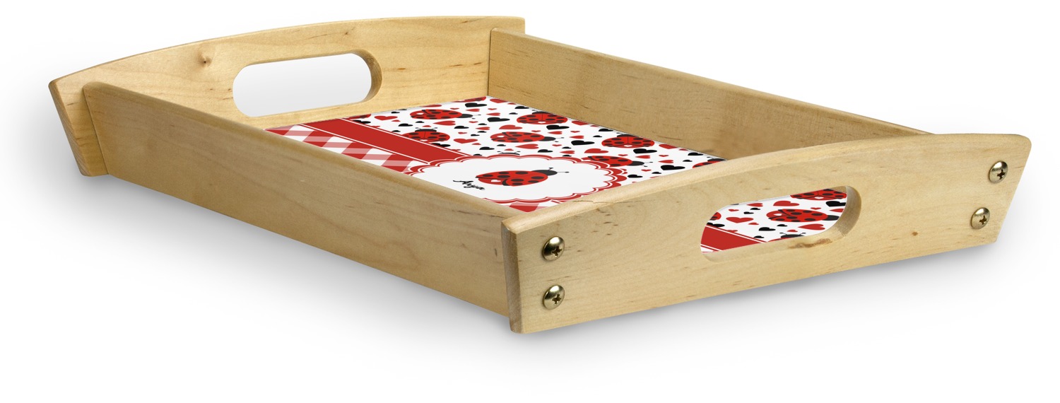 This serving tray with handles features square edges and two rounded sides, creating a very modern look. Each side is fabricated from a beautifully cut, natural wood. The bottom of the interior of the tray displays your customized design in bright, vibrant color. The tray is sold in both a black color and a natural wood look. Each variation of the wood serving tray has two sizes: Small, which is 14" x 10" x 2.25", and Large, which is 19.5" x 13.5" x 2.75".