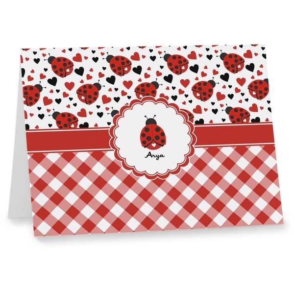 A wide band of red with an inset of black trim pulls the design together. A cute ladybug sits in the middle of a white scalloped circle label that is trimmed in double rows of red. Under the ladybug is ample room for custom personalization.