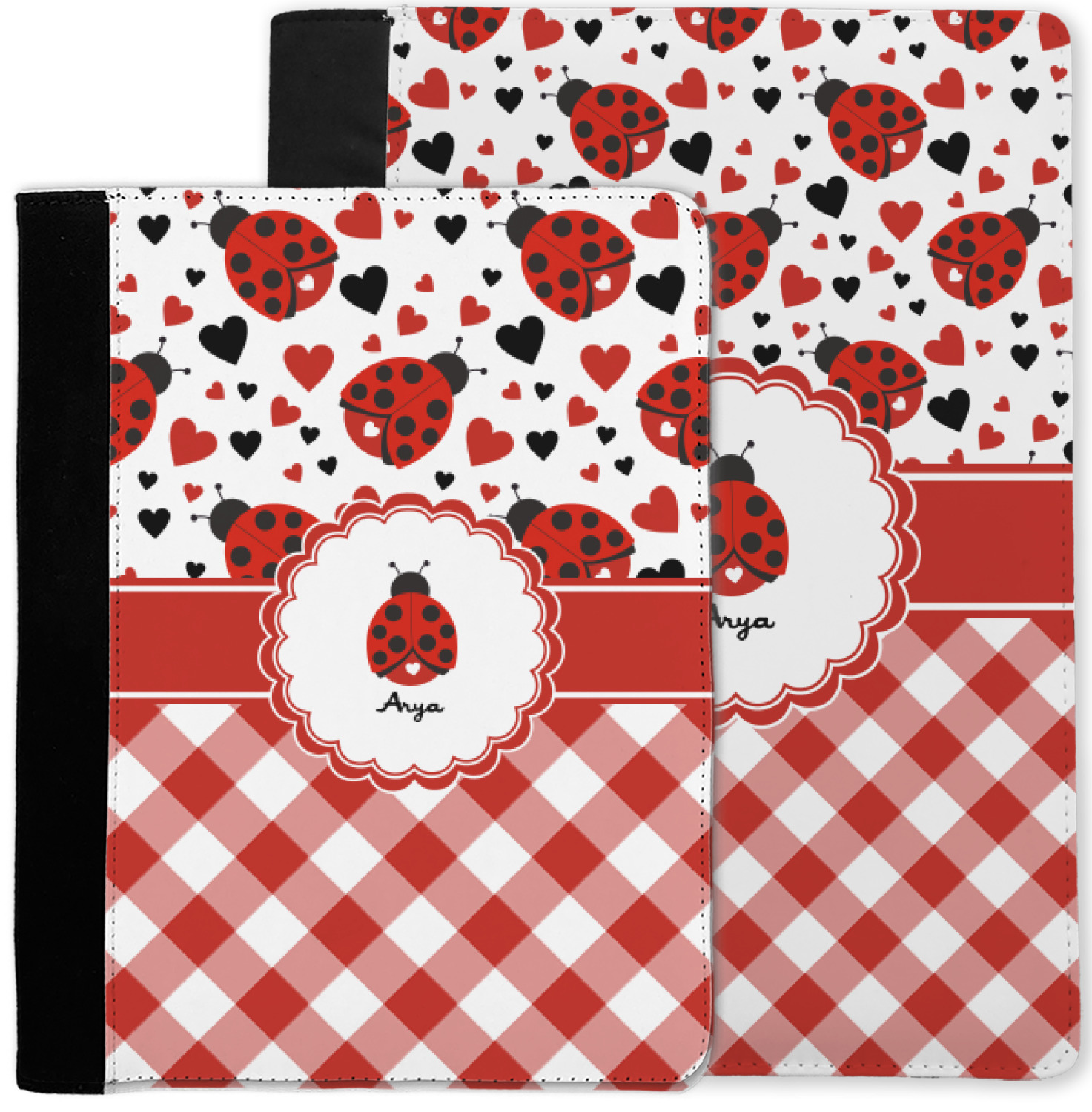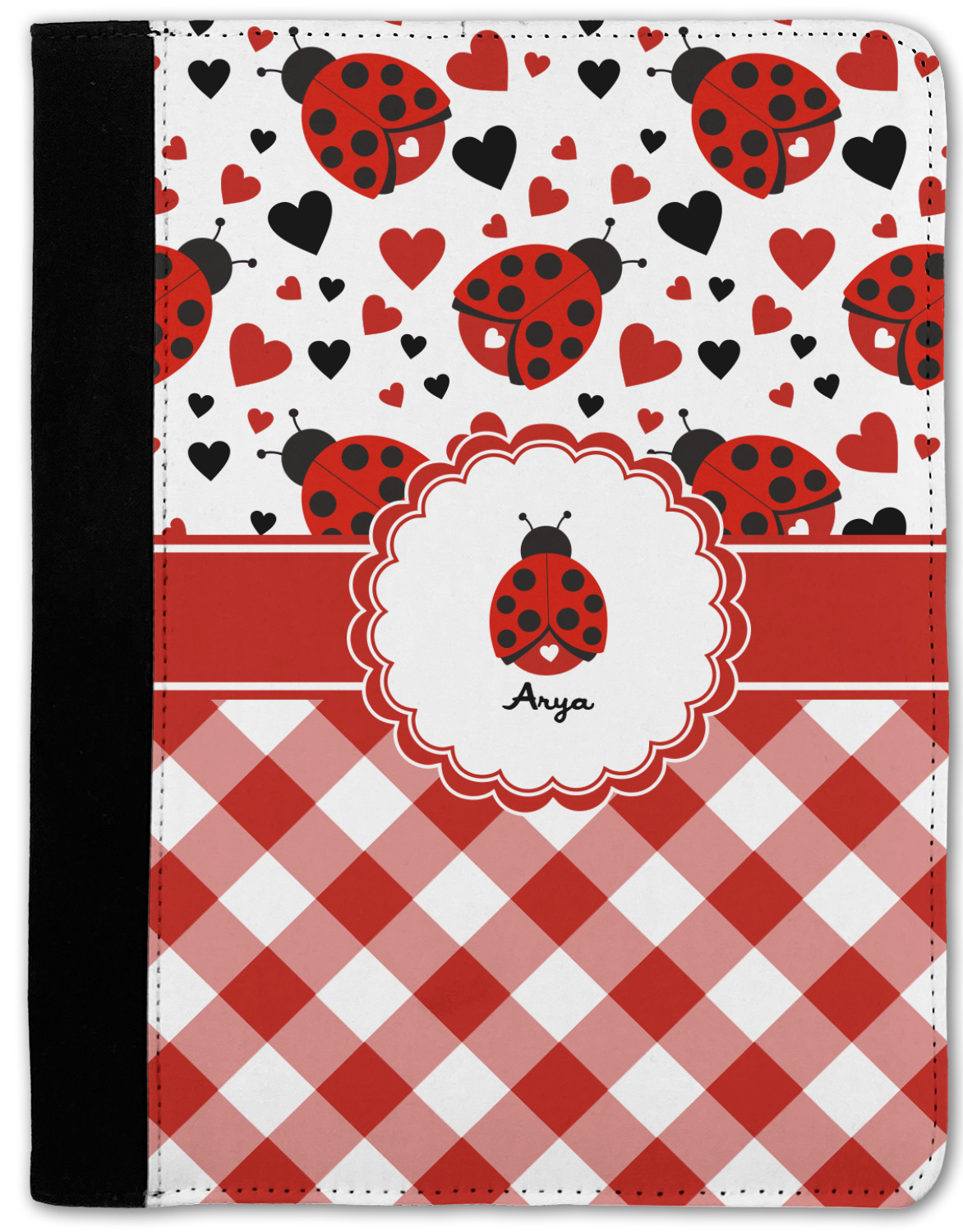 Ladybugs stand for luck so why not start your day off surrounded by the symbol of luck? On the top part of the design our little ladybugs are surrounded by coordinating black and red hearts. As if the ladybugs weren't sweet enough we added a touch of nostalgia by including the all American red and white gingham pattern to the bottom of this wonderful and warm design.
