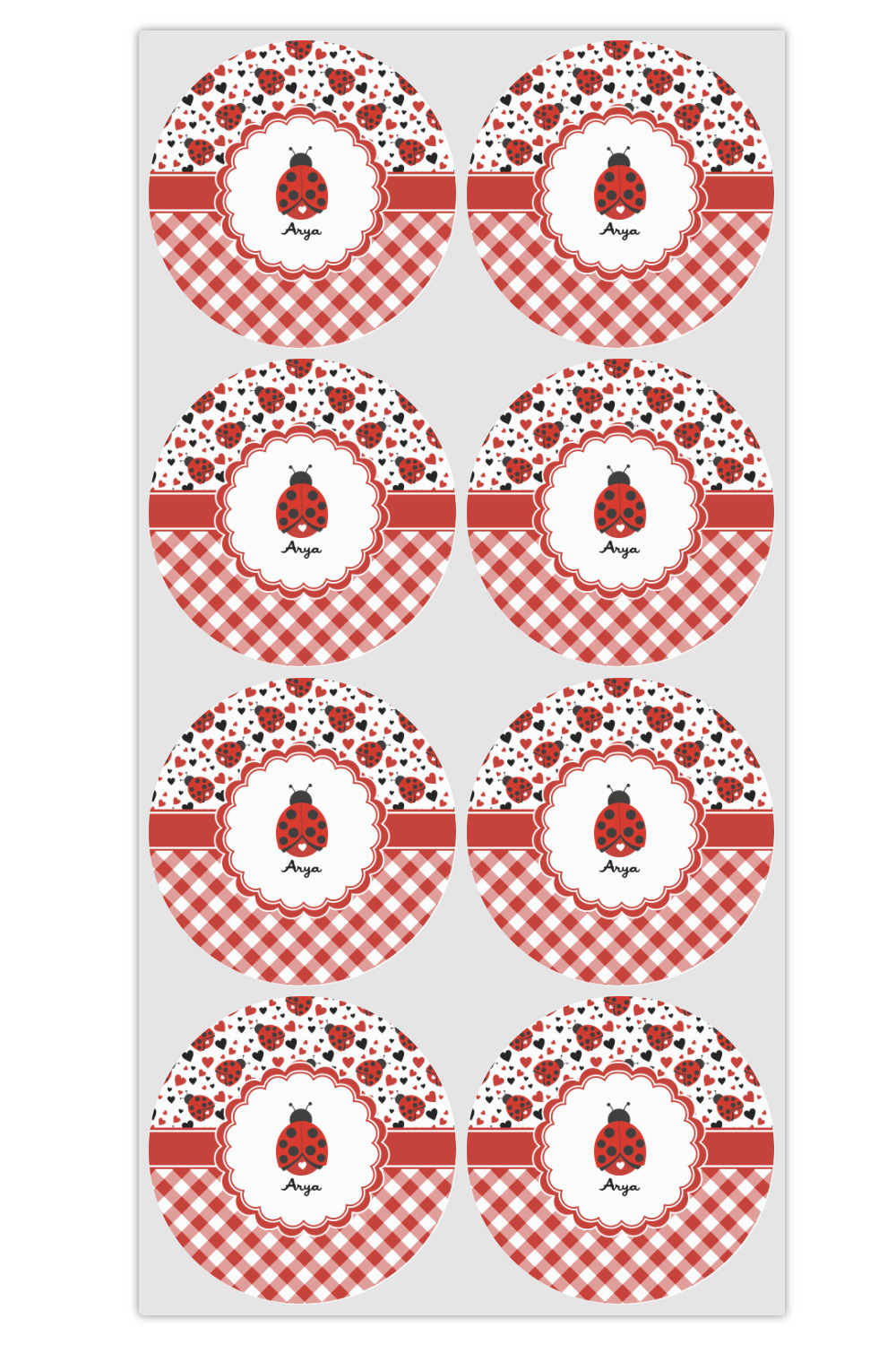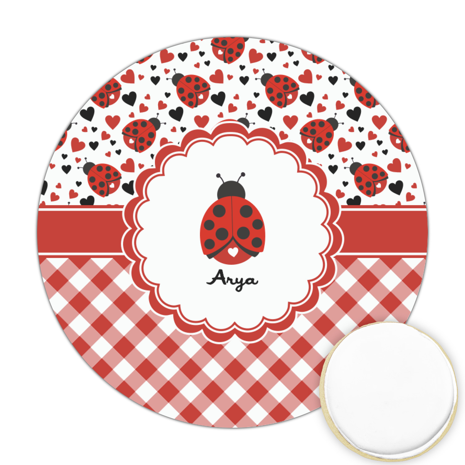 A wide band of red with an inset of black trim pulls the design together. A cute ladybug sits in the middle of a white scalloped circle label that is trimmed in double rows of red. Under the ladybug is ample room for custom personalization.