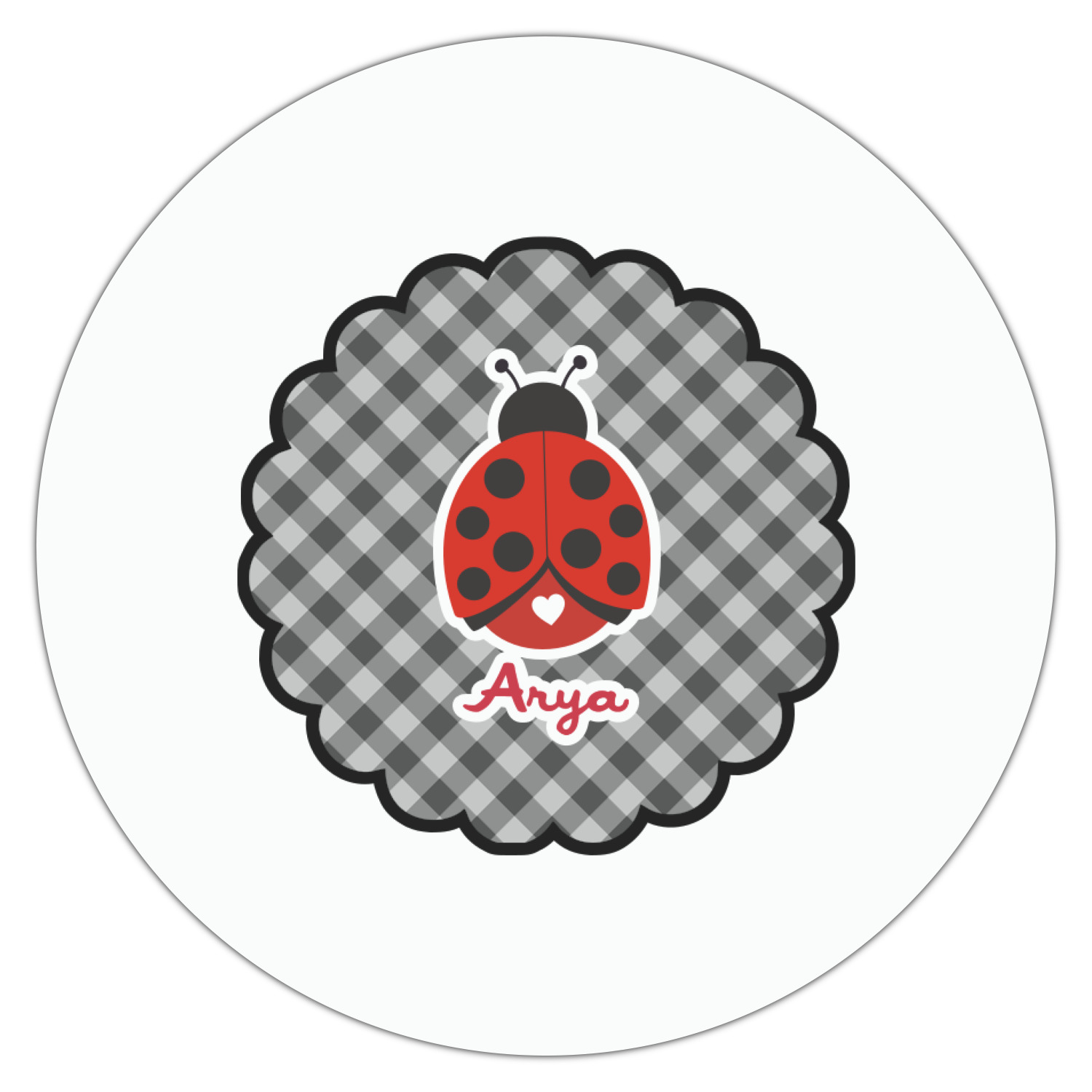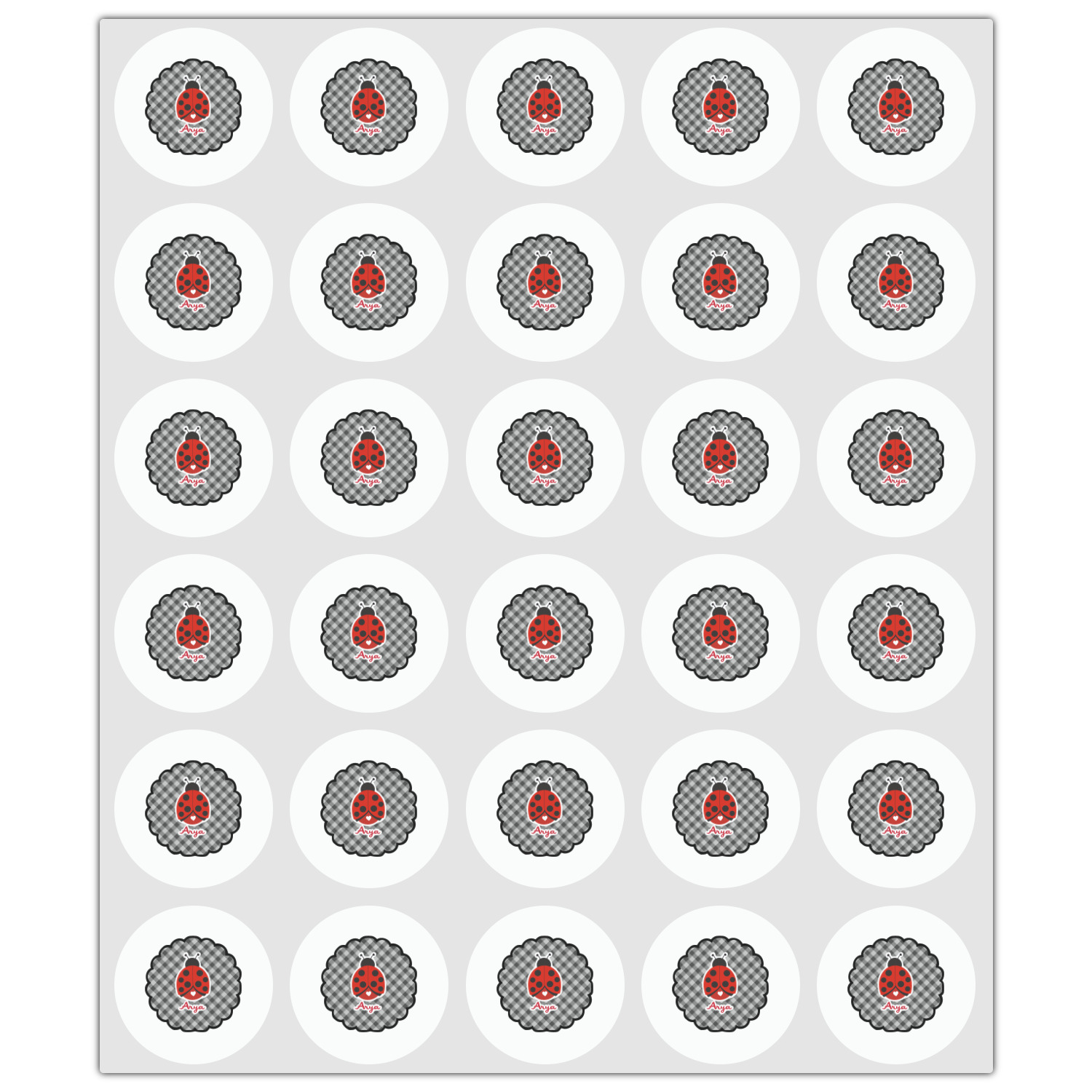 A wide band of red with an inset of black trim pulls the design together. A cute ladybug sits in the middle of a white scalloped circle label that is trimmed in double rows of red. Under the ladybug is ample room for custom personalization.