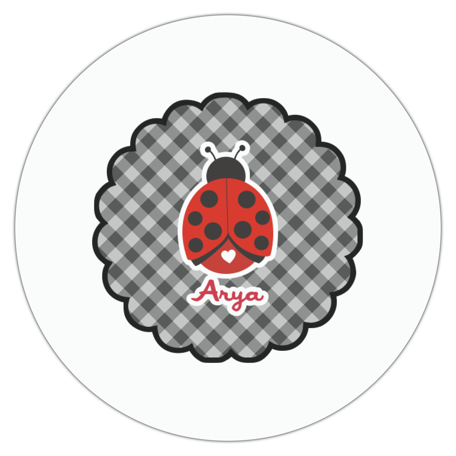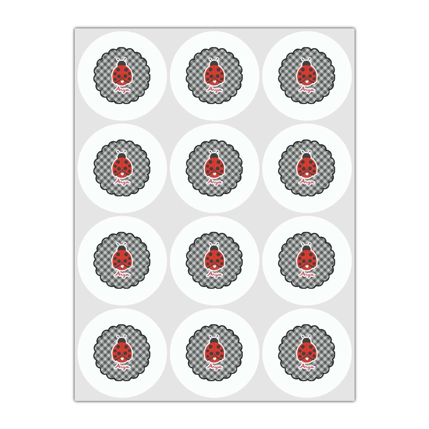 A wide band of red with an inset of black trim pulls the design together. A cute ladybug sits in the middle of a white scalloped circle label that is trimmed in double rows of red. Under the ladybug is ample room for custom personalization.