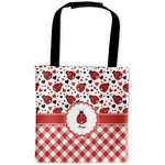 A wide band of red with an inset of black trim pulls the design together. A cute ladybug sits in the middle of a white scalloped circle label that is trimmed in double rows of red. Under the ladybug is ample room for custom personalization.