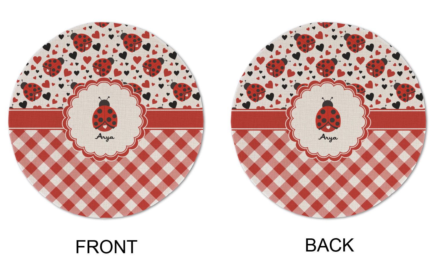 A wide band of red with an inset of black trim pulls the design together. A cute ladybug sits in the middle of a white scalloped circle label that is trimmed in double rows of red. Under the ladybug is ample room for custom personalization.