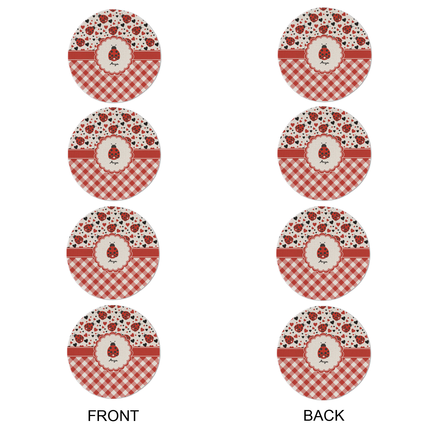 A wide band of red with an inset of black trim pulls the design together. A cute ladybug sits in the middle of a white scalloped circle label that is trimmed in double rows of red. Under the ladybug is ample room for custom personalization.
