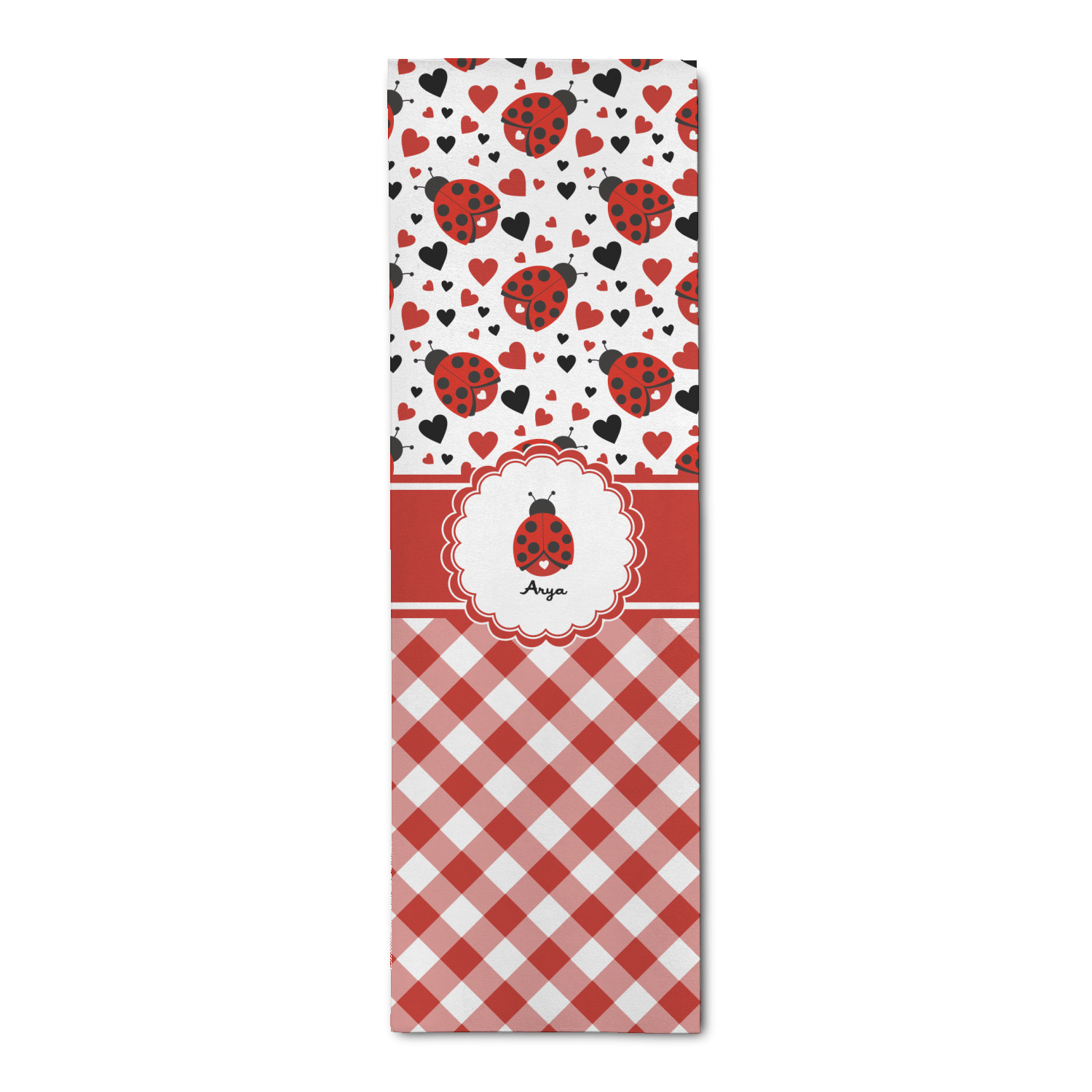 Ladybugs stand for luck so why not start your day off surrounded by the symbol of luck? On the top part of the design our little ladybugs are surrounded by coordinating black and red hearts. As if the ladybugs weren't sweet enough we added a touch of nostalgia by including the all American red and white gingham pattern to the bottom of this wonderful and warm design.