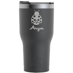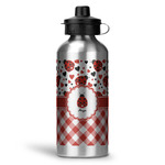 A wide band of red with an inset of black trim pulls the design together. A cute ladybug sits in the middle of a white scalloped circle label that is trimmed in double rows of red. Under the ladybug is ample room for custom personalization.