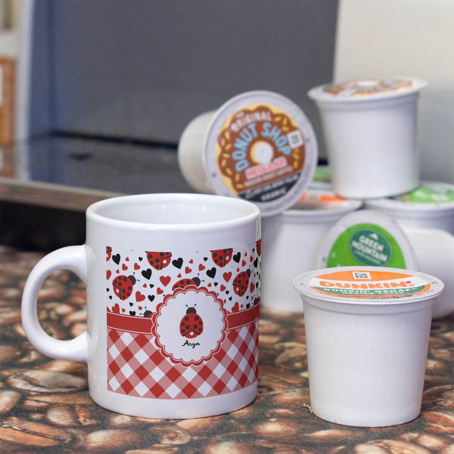 Ladybugs stand for luck so why not start your day off surrounded by the symbol of luck? On the top part of the design our little ladybugs are surrounded by coordinating black and red hearts. As if the ladybugs weren't sweet enough we added a touch of nostalgia by including the all American red and white gingham pattern to the bottom of this wonderful and warm design.
