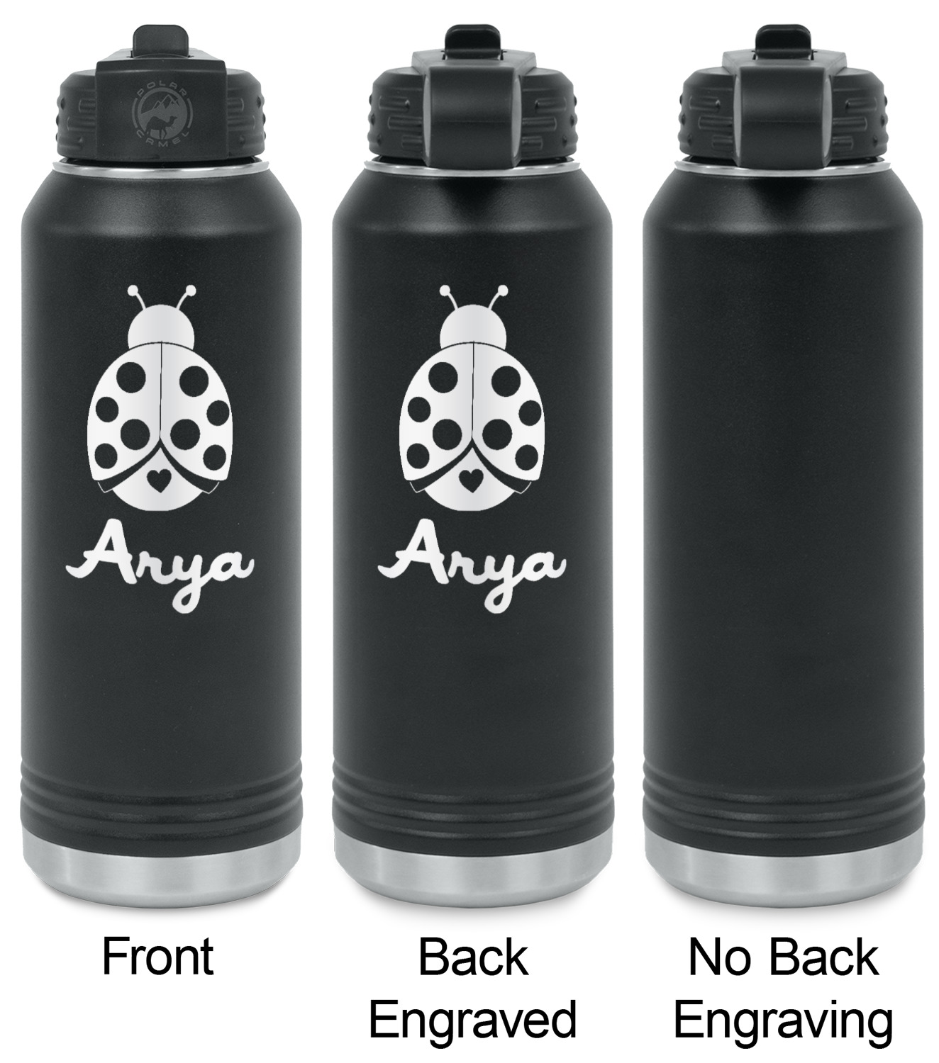 Your design is laser engraved on the water bottles. The engraving removes the black powder coating in the designed area to expose the silver stainless steel underneath.