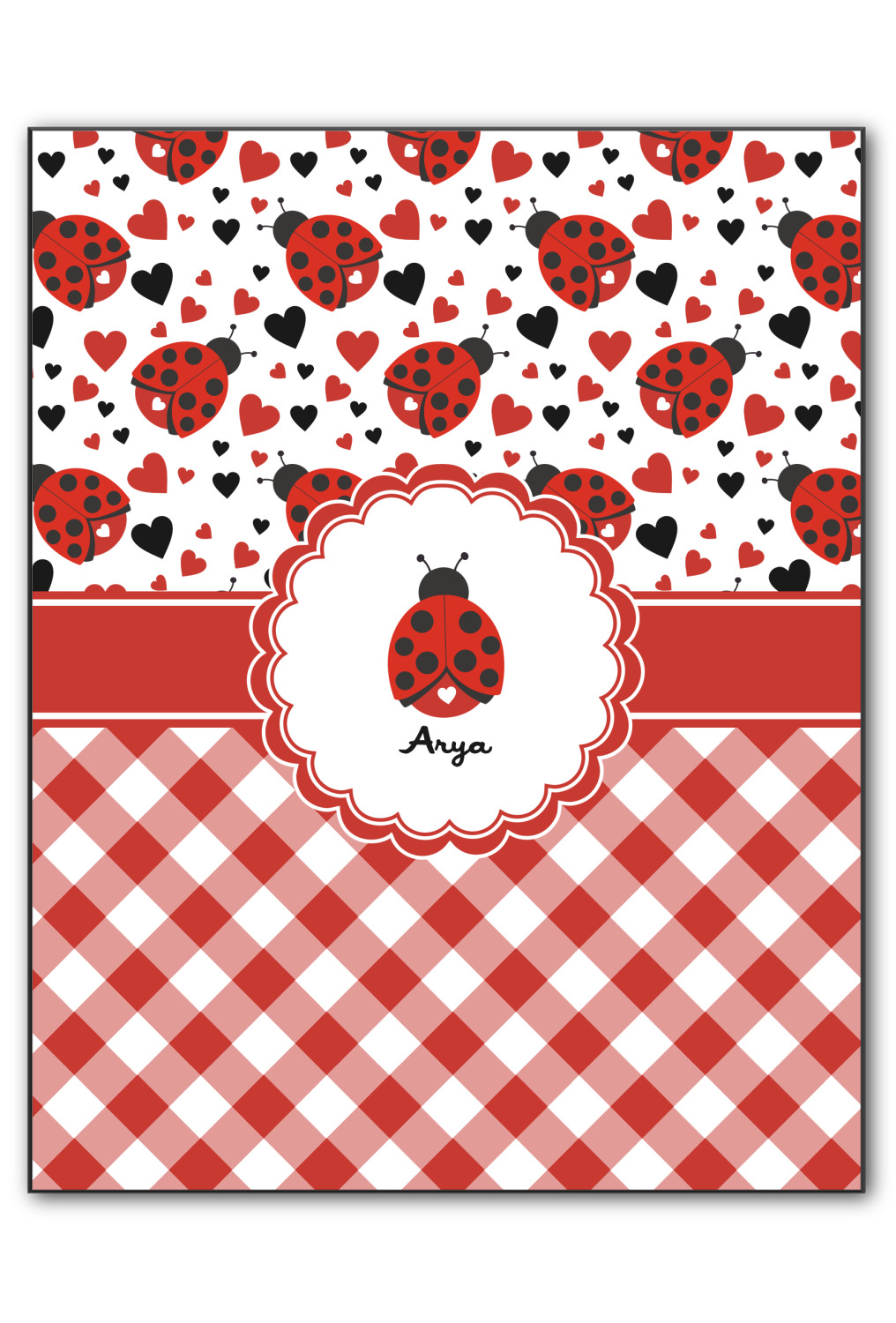 A wide band of red with an inset of black trim pulls the design together. A cute ladybug sits in the middle of a white scalloped circle label that is trimmed in double rows of red. Under the ladybug is ample room for custom personalization.