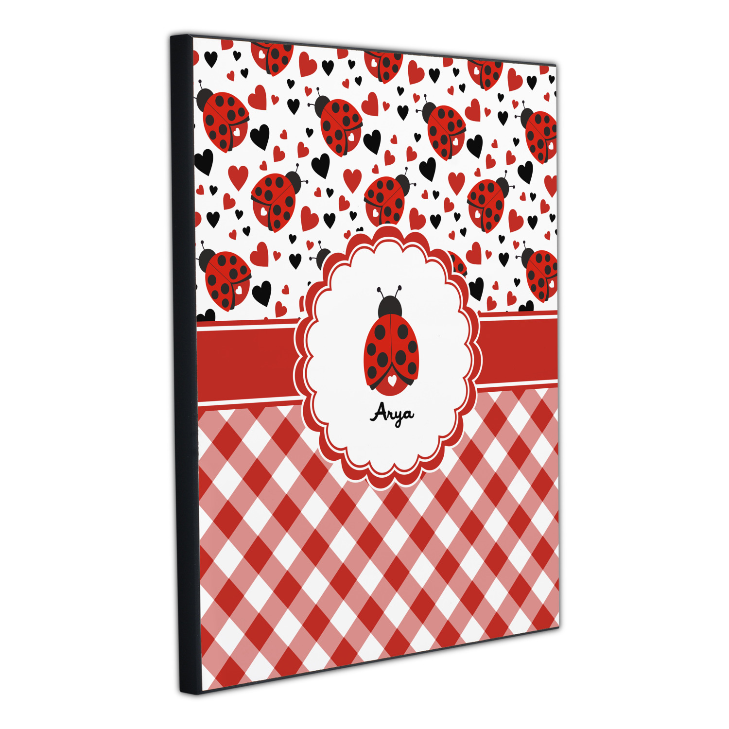 Ladybugs stand for luck so why not start your day off surrounded by the symbol of luck? On the top part of the design our little ladybugs are surrounded by coordinating black and red hearts. As if the ladybugs weren't sweet enough we added a touch of nostalgia by including the all American red and white gingham pattern to the bottom of this wonderful and warm design.
