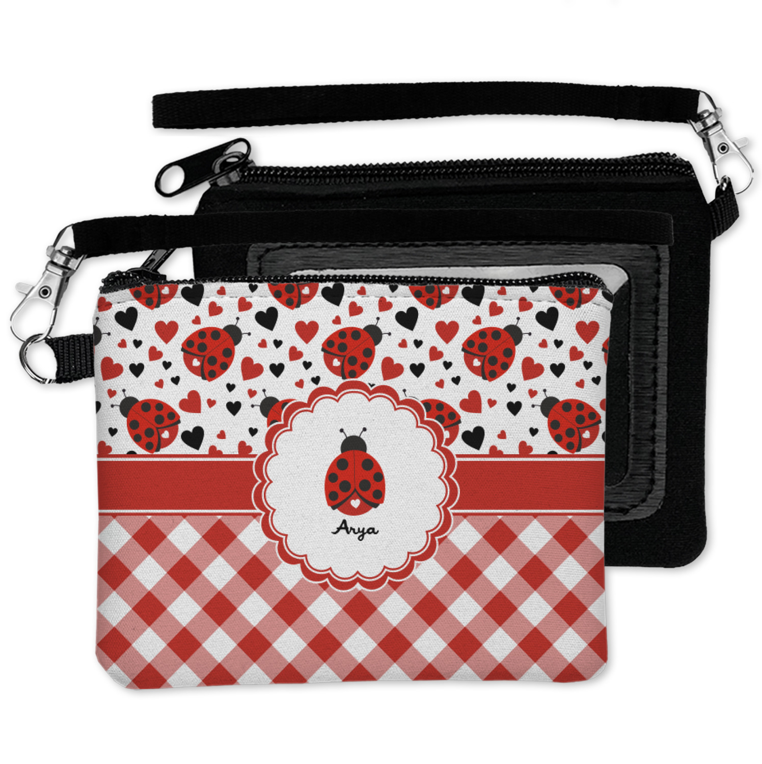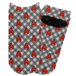 Ladybugs stand for luck so why not start your day off surrounded by the symbol of luck? On the top part of the design our little ladybugs are surrounded by coordinating black and red hearts. As if the ladybugs weren't sweet enough we added a touch of nostalgia by including the all American red and white gingham pattern to the bottom of this wonderful and warm design.