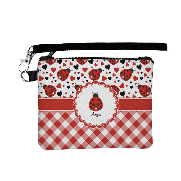 A wide band of red with an inset of black trim pulls the design together. A cute ladybug sits in the middle of a white scalloped circle label that is trimmed in double rows of red. Under the ladybug is ample room for custom personalization.