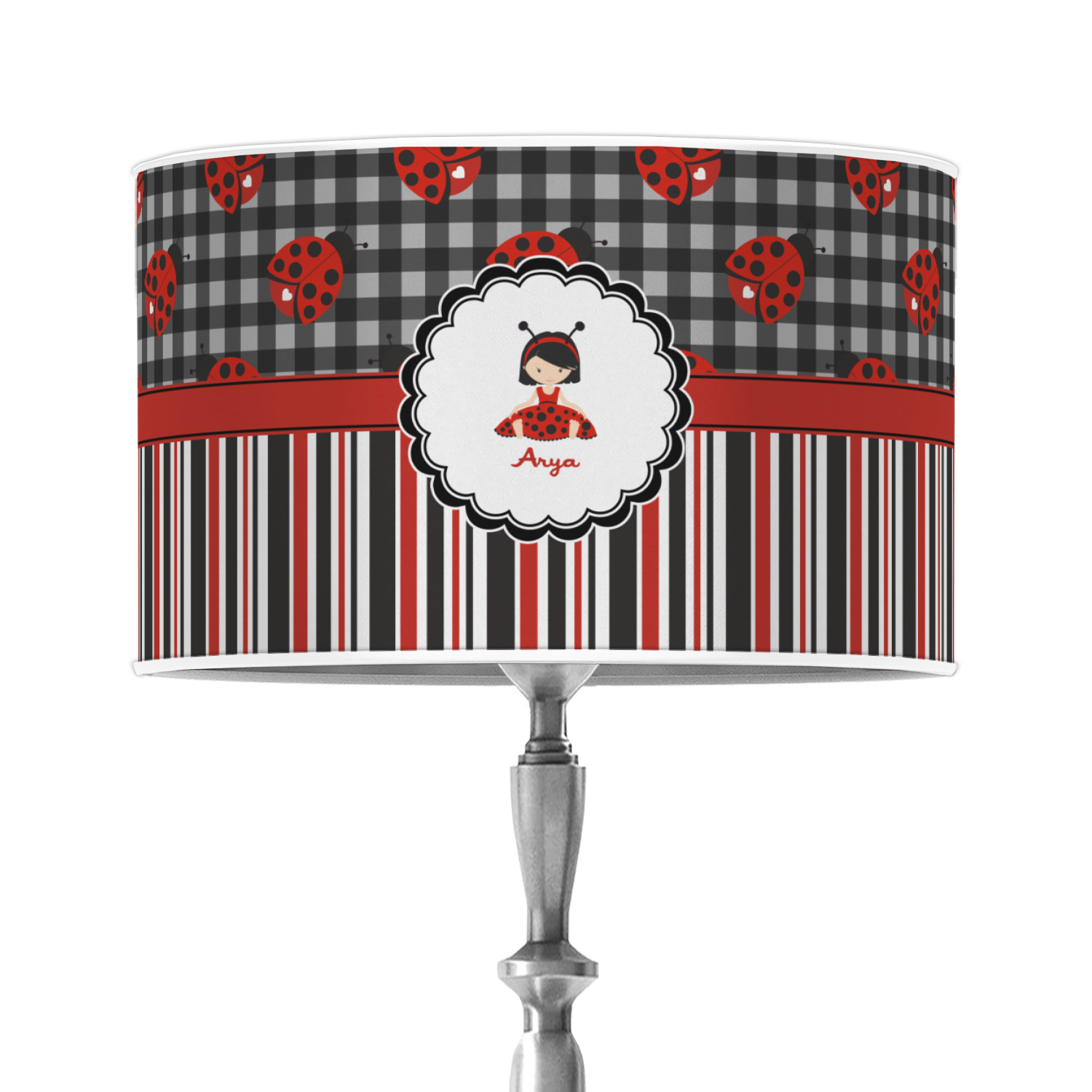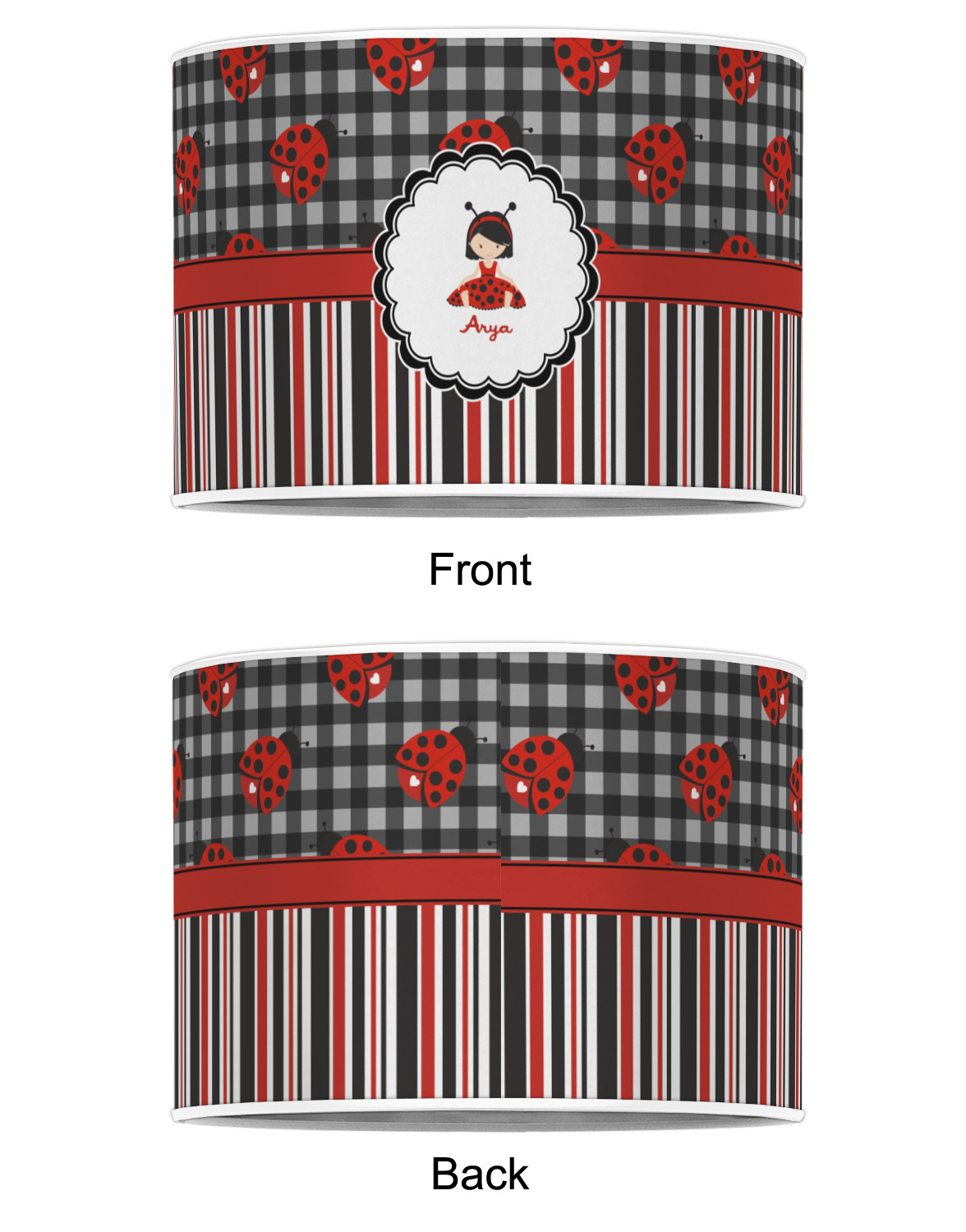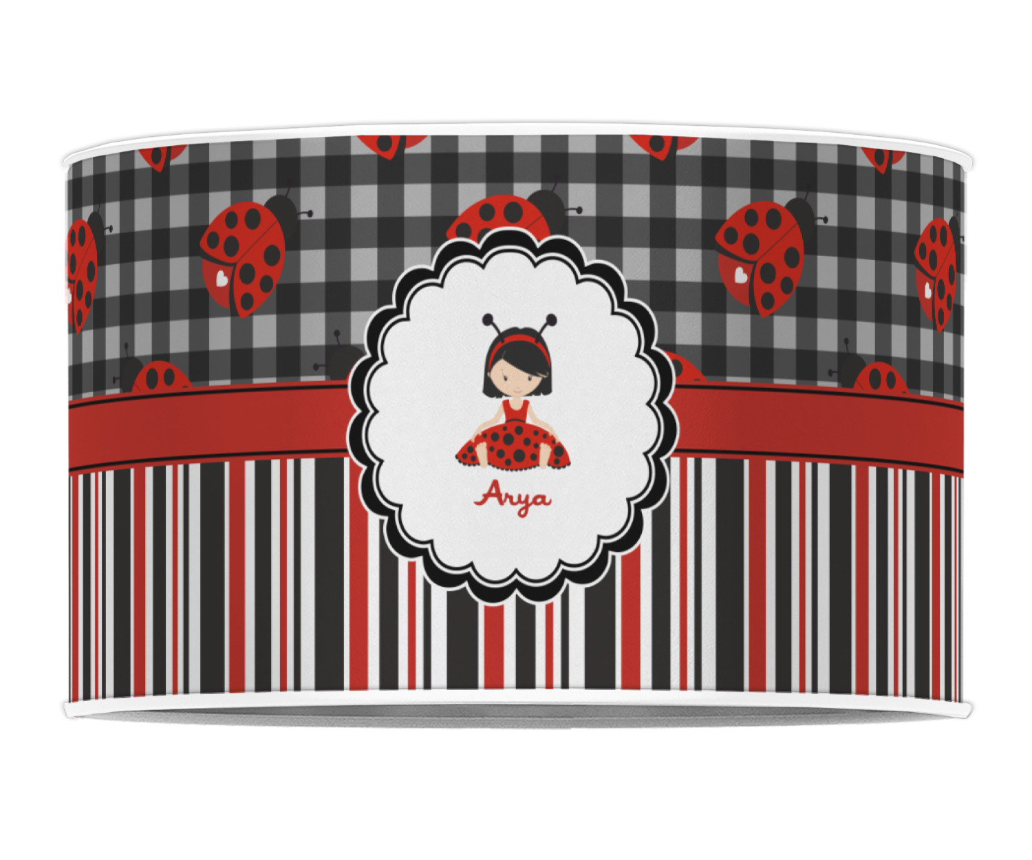 A wide band of red with an inset of black trim pulls the design together. A cute little girl dressed as a ladybug sits in the middle of a white scalloped circle label that is trimmed in double rows of black. Under the ladybug girl is ample room for custom personalization.