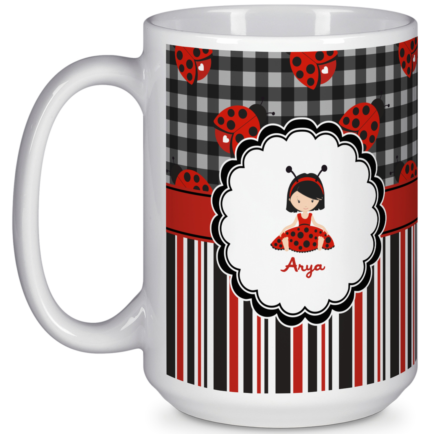 A wide band of red with an inset of black trim pulls the design together. A cute little girl dressed as a ladybug sits in the middle of a white scalloped circle label that is trimmed in double rows of black. Under the ladybug girl is ample room for custom personalization.