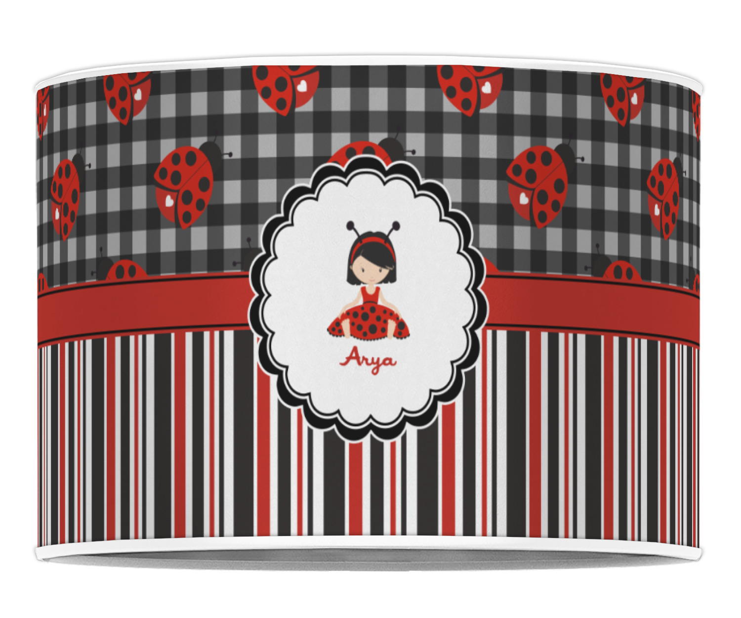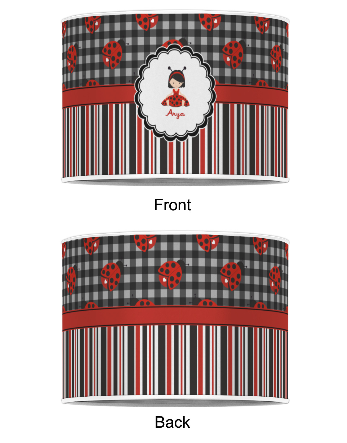A wide band of red with an inset of black trim pulls the design together. A cute little girl dressed as a ladybug sits in the middle of a white scalloped circle label that is trimmed in double rows of black. Under the ladybug girl is ample room for custom personalization.