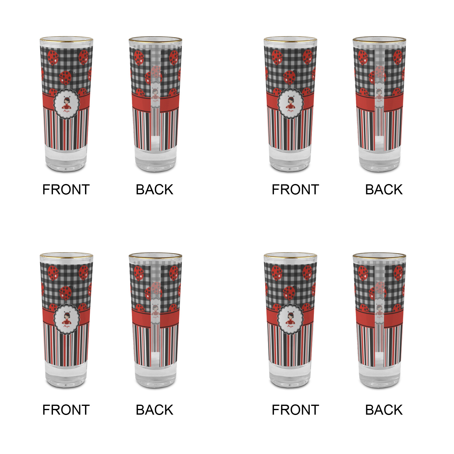 These glass shooter glasses are printed in full color with the design of your choice. These are a tall shooter 2 oz size and stand 4" tall. The print is a full wrap design to boldly display your personalization.
