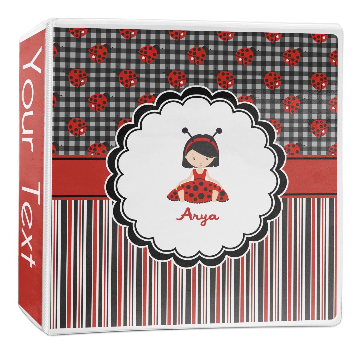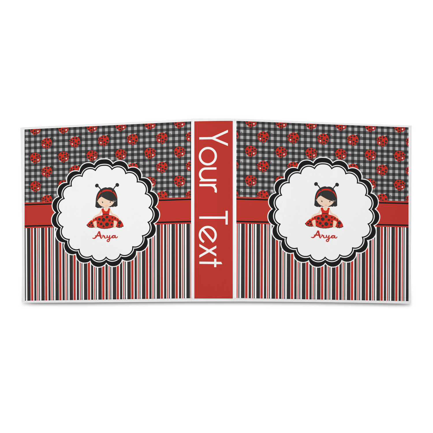 A wide band of red with an inset of black trim pulls the design together. A cute little girl dressed as a ladybug sits in the middle of a white scalloped circle label that is trimmed in double rows of black. Under the ladybug girl is ample room for custom personalization.