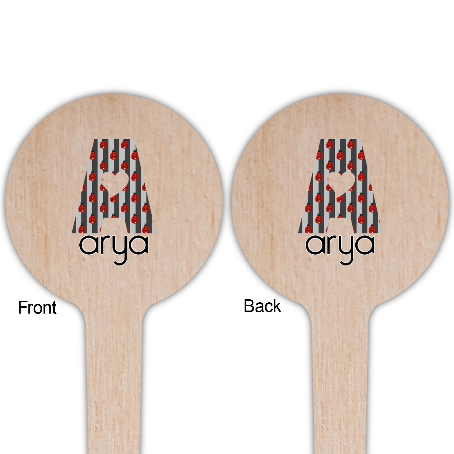 A wide band of red with an inset of black trim pulls the design together. A cute little girl dressed as a ladybug sits in the middle of a white scalloped circle label that is trimmed in double rows of black. Under the ladybug girl is ample room for custom personalization.