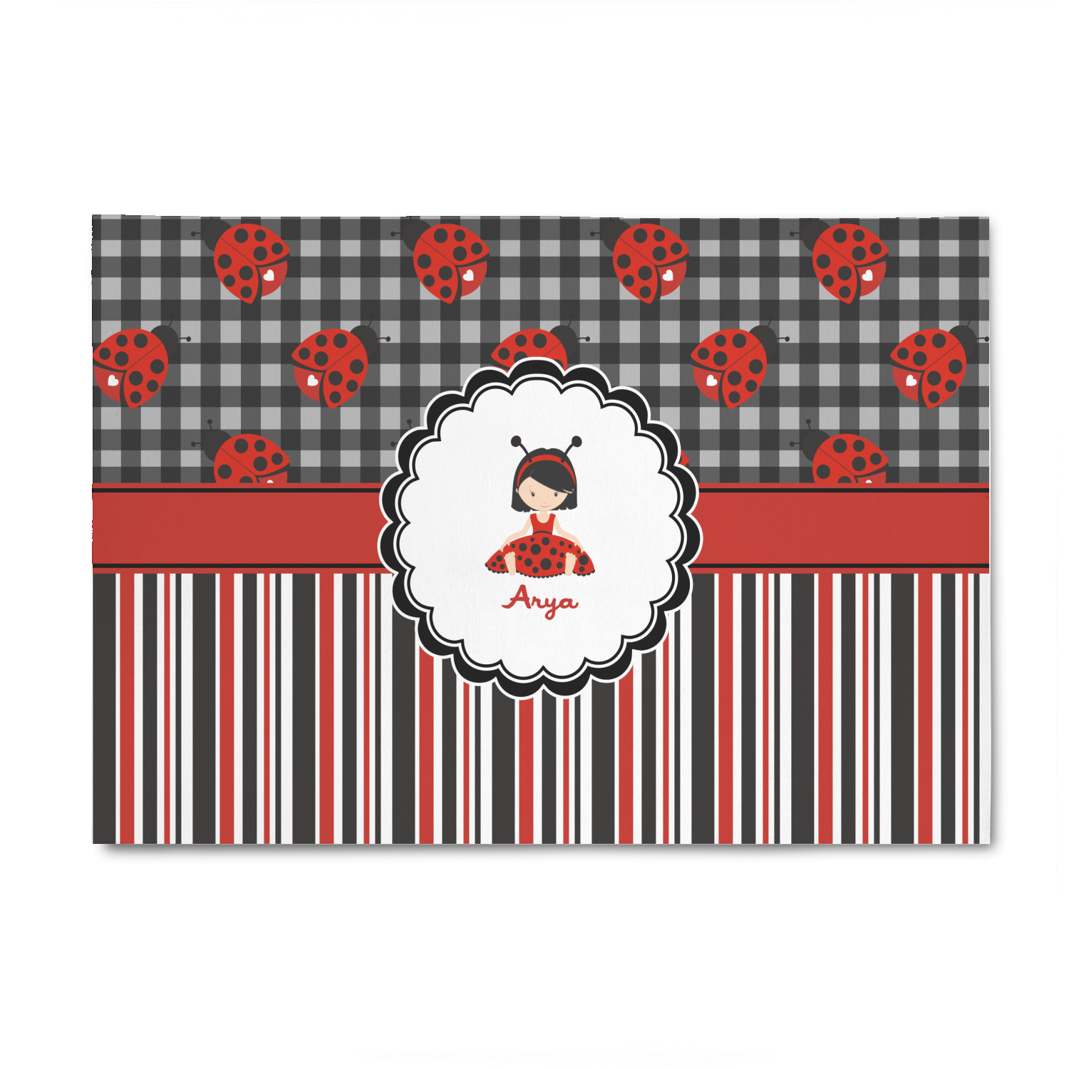 A wide band of red with an inset of black trim pulls the design together. A cute little girl dressed as a ladybug sits in the middle of a white scalloped circle label that is trimmed in double rows of black. Under the ladybug girl is ample room for custom personalization.